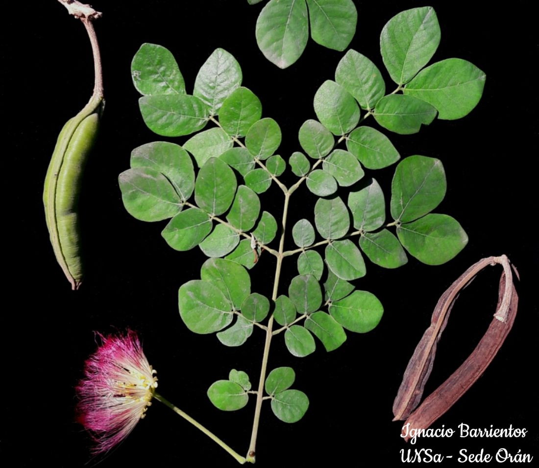 Árbol pequeño de 3-8(-10) m de altura y 20-30 cm diám., con ramificación simpodial y fuste breve, ocasionalmente de hábito arbustivo; copa amplia de ramas plagiótropas. Corteza amarillenta, gruesa y corchosa, profundamente fisurada longitudinalmente. Ramas hornótinas floríferas con densa pubescencia amarillenta de tricomas simples. Hojas 4-6 yugadas, indumento de tricomas simples amarillentos; pecíolo de 4-6,5 cm, con una glándula pateliforme sésil basal en el haz, de 3- 3,2 x 2-2,2 mm, en vivo anaranjada, con margen irregular grueso y amarillo; raquis primario de 14-18 cm., eglanduloso; raquis secundario 2-4- yugado, desde 1 cm en las pinnas basales hasta 8,5 cm en las apicales, con una glándula entre cada par de folíolos, de 1 x 0,4-0,5 mm., pateliforme oval y amarilla. Folíolos de 2,5-5 x 2-3,8 cm, mayores hacia el ápice de cada pina, anchamente obovados o anchamente elípticos, asimétricos, de ápice redondeado a abruptamente agudo, base cuneada a redondeada, venación pinnada, densamente pubescentes en el haz, glaucos y tomentosos en el envés; peciólulos de 1,2-1,4 mm. Cabezuelas umbeliformes, (1-)2 en la axila de hojas histerantas en las ramas hornótinas, con hasta 30(-36) flores heteromorfas; pedúnculos de 7-8 cm, brácteas de 2 x 0,5 mm, obovadas a espatuladas, hirsuto-pubescentes. Flores periféricas con pedicelos de (0,1-0,2-)-0,4 cm, pubescentes; cáliz de 0,6-0,9 cm, tubular infundibuliforme, verde en vivo, velutino, con 5 lóbulos triangulares; corola de (0,9-)1,2-1,85 cm, infundibuliforme, amarilla en vivo, densamente serícea, con (4-)5(-6) lóbulos lanceolados provistos de numerosas papilas glandulares en el ápice; androceo de 3-4 cm, tubo estaminal de 1,3 cm, incluso o algo exserto, filamentos amarillo-claro en su mitad basal y rosados en la apical; ovario de 0,3-0,4 cm, sésil, oblongo, seríceo, pubescente hacia el ápice; estilo excéntrico, de 3 cm; estigma diminuto. Flor central sésil: cáliz tubular de 1,1 1,2 cm, urceolado, costado; corola de 2,2-2,4 cm, tubular, lóbulos regulares o irregulares, triangulares; androceo con el tubo estaminal robusto, inserto; ovario de 0,5 cm, angular-obovado; estigma subcapitado. Legumbre indehiscente, recta a subrecta, de 8-21 x 1,5-1,8 cm, ápice con mucrón curvo de 0,3-1 cm, márgenes engrosados de 0,3 0,4 mm lat..; epicarpo tomentoso, liso, suturas interseminales apenas distinguibles, longitudinal mente estriado cuando seco. Semillas uniseriadas, 10-20, de 1-1,9 x 0,4- 0,6 x 0,53- 0,63 cm, pardo oscuras, línea fisural de 0,7-0,9 x 0,3-0,5 cm, abierta hacia la micrópila, de contorno ovado a elíptico, área delimitada por la línea fisural con líneas de fractura longitudinales.