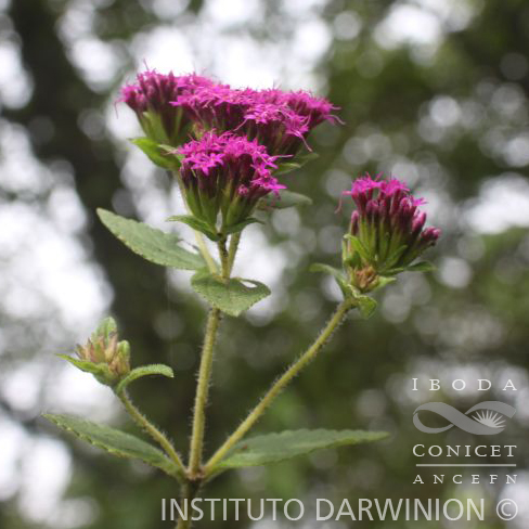Hierbas perennes, erectas, de 0,50-1 m de alto, tallos con pubescencia crespa y a veces glandulosos. Hojas pecioladas, ovadas, de 3-9 × 3-5 cm, redondeado-acorazonadas en la base y agudas en el ápice, aserradas, punteado-glandulosas en el envés. Capítulos sésiles o brevísimamente pedunculados, dispuestos en cimas glomeriformes largamente pedunculadas, por lo común agrupados de a 3 en dicasios en los extremos de las ramas. Involucro de 5-7 mm de alto; filarios agudos, con pelos curvos y glandulosos en el dorso, raramente sólo glandulosos. Flores con corolas lilacinas o de color vinoso de 4-5 mm de largo, pubescentes. Papus ligeramente dimorfo, formado por escamas cortas (acompañadas por 2 pajitas en los adelfocarpos), o bien por aristas casi tan largas como las corolas (5 en los adelfocarpos y sólo 3 en los idiocarpos).
