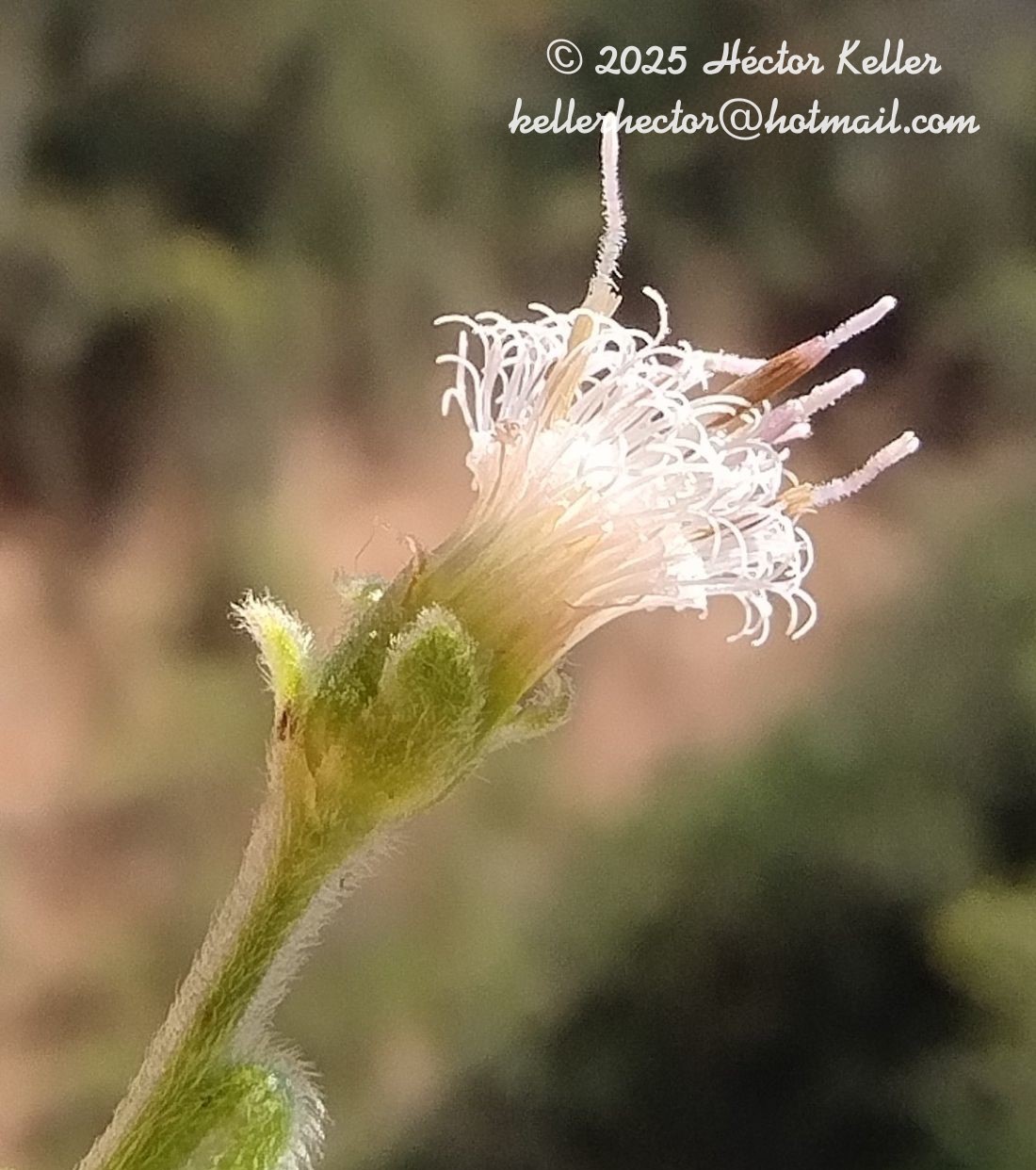 Arbustos o subarbustos ramosos, pubescentes, de 1-1,5 m de alto; tallos jóvenes densamente velludos y hojosos, glabrescentes y sin hojas a la madurez. Hojas alternas, brevemente pecioladas, con pecíolos de 2-10 mm de largo; láminas anchamente lanceoladas, de 5-13 × 1,5-4 cm, cuneiformes en la base, agudas en el ápice, enteras en el margen, velludas en ambas caras. Capítulos muy numerosos, cortamente pedunculados, con pedúnculos de 3-10 mm de largo, dispuestos en cimas corimbiformes terminales. Receptáculo glabro. Involucro acampanado, ca. 5 × 3 mm; filarios 3-4-seriados, los externos ovados, velludos en el dorso, los internos lineares, glabros. Flores con corola blanca, las del margen numerosas, pistiladas, con corola filiforme, ca. 4 mm de largo; las del centro 6-18, con corola tubulosa, de 3,5-5 mm de largo, 5-lobada, lóbulos de 0,4-0,5 mm de largo, papilosos, estilo con ramas cortas. Aquenios laxamente pubescentes con pelos dobles. Papus blanco, formado por cerdas escabrosas, casi tan largo como la corola.