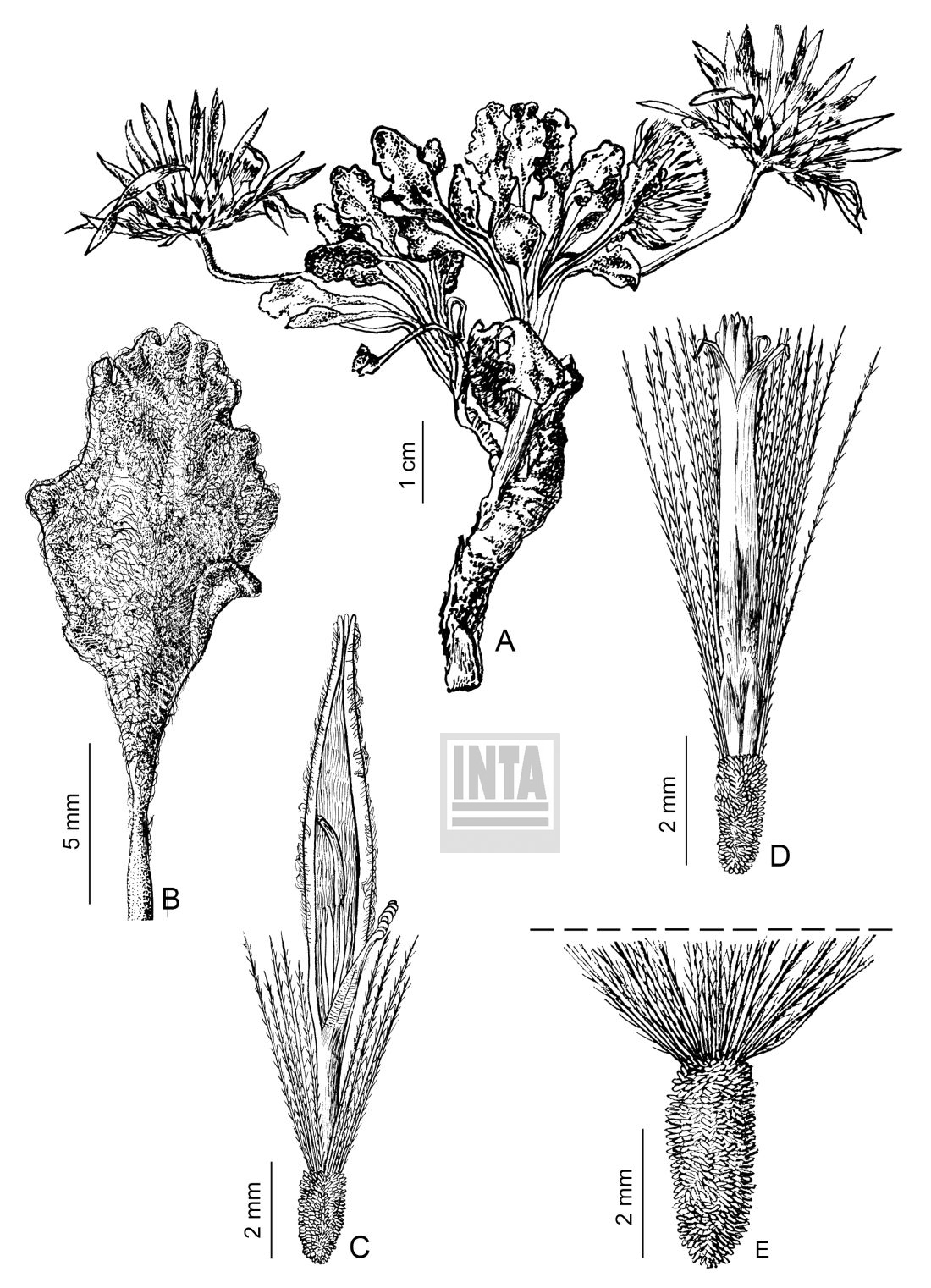 A. Planta. B. Hoja. C. Flor del margen. D. Flor del centro. E. Aquenio y papus (recortado).