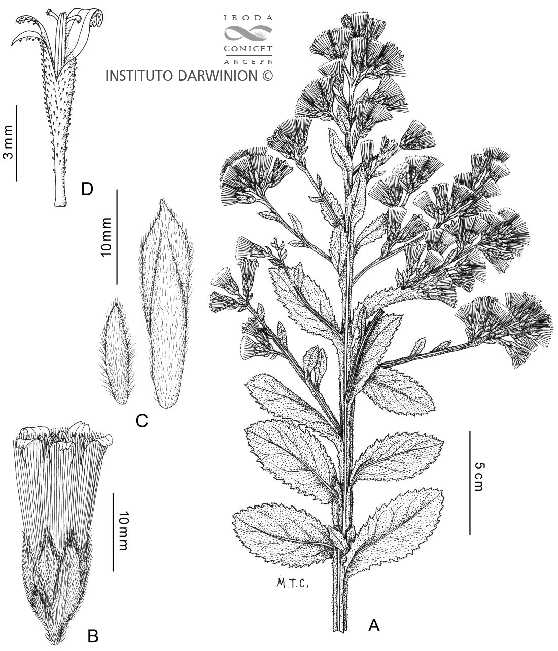 A. Rama florífera. B. Capítulo. C. Filarios. D. Flor (ovario y papus no dibujados).