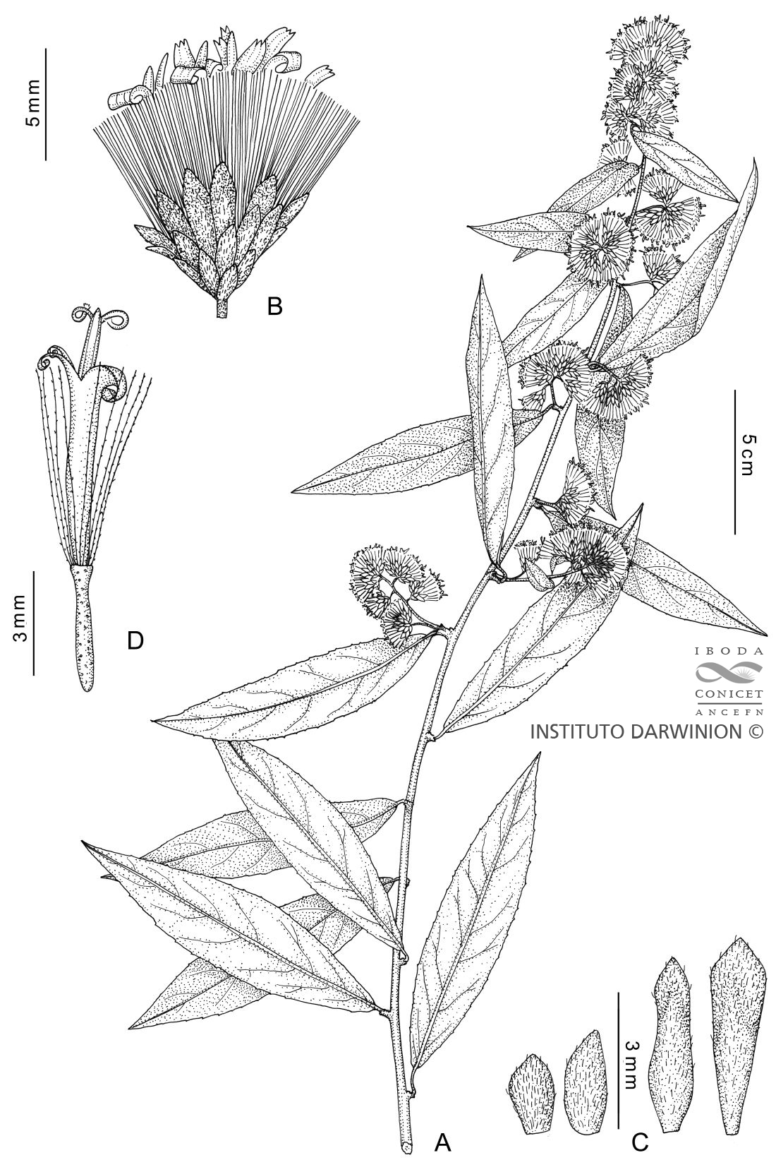 Arbustos hasta de 3 m de alto, con tallos apoyantes, pubérulos a villosos. Hojas alternas, sésiles o pecioladas, elípticas, de 6,5- 16 × 2-3,3 cm, atenuadas en la base, agudas en el ápice, enteras o levemente denticuladas en el margen, estrigosas en la haz, estrigosas a tomentosas en el envés. Capítulos dispuestos en cimas racemiformes densas. Involucro acampanado, de 5 × 6-12 mm; filarios 4-5-seriados, ovados a linear-lanceolados, pubescentes. Flores 10-20, corola amarilla, de 9-10 mm de largo. Aquenios de base redondeada, de 2-3 mm de largo. Papus amarillo pálido, caduco, cerdas dispuestas en 1 serie, de 6-7 mm de largo.