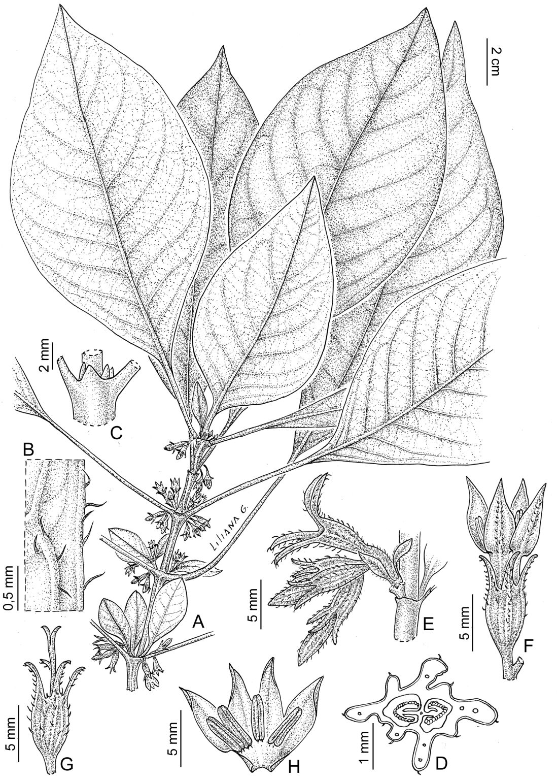 A. Rama con flores. B. Margen foliar. C. Estípula. D. Corte transversal de hipanto y ovario. E. Porción de la inflorescencia axilar. F. Flor perfecta. G. Hipanto, estilo y estigma. H. Corola desplegada y androceo.