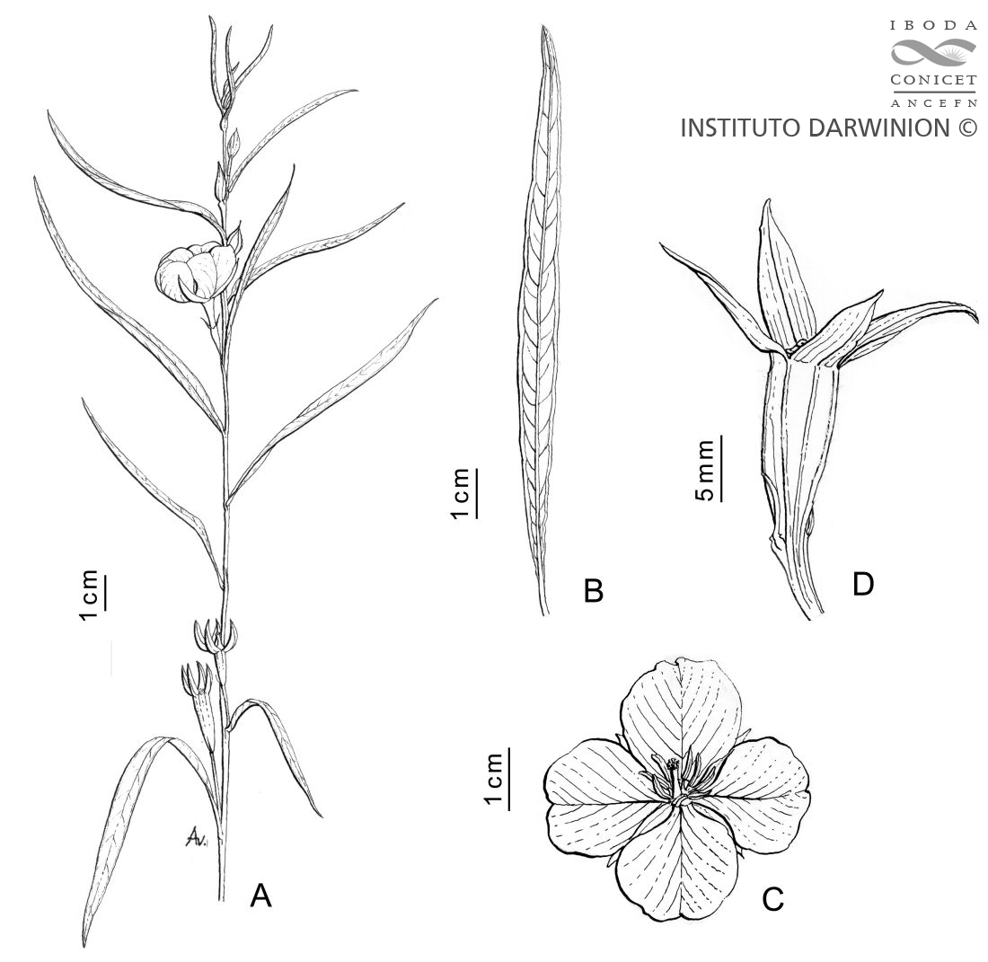 Hierba anual, 0,5-2 m de alto, glabra, erecta. Tallos muy ramificados, 4-gonos. Estípulas glandulosas, casi hundidas en los tallos, ca. 0,5 mm long. y 0,2 mm lat. Hojas 6-25 cm long. y 9,5-2,5 cm lat., lanceoladas o angostamente lanceoladas, sésiles, agudas o acuminadas, las basales a menudo emarginadas en el ápice, obtusas, agudas o cuneadas en la base, membranáceas, enteras o dentadas y rojizas en el margen, con 6-30 pares de nervios secundarios, venas terciarias pocas y anastomosadas y nervio submarginal prominente. Brácteas 3-6 cm long. y 1-1,5 cm lat. Pedicelos 4-gonos, 0,5-2 (-6) cm long. Bractéolas cerca del ápice del pedicelo, opuestas o subopuestas, linear lanceoladas, caducas, sostenidas por un par de estipélulas glandulares. Sépalos 4, 1,2- 2 cm long. x 0,4-0,6 cm lat., ovados, cortamente acuminados, enteros o a veces menudamente dentados en el margen. Pétalos blancos, amarillentos en la base, orbiculares, clavados, 2,2-2,5 cm lat. Estambres desiguales, con filamentos blanquecinos, los episépalos más largos, 2,2-2,5 mm long., los epipétalos 1,2-1,5 mm long., y anteras amarillas, de 5-8 mm long. en estambres episépalos y de ~-6 mm en estambres epipétalos; filamentos curvándose alrededor del estilo y retorciéndose alrededor de su propio eje, colocando a las anteras en contacto con el estigma; polen blanco, vertido directamente sobre el estigma durante la antesis. Ovario 4-gono, 0,5-1,5 cm long. x 0,2-0,7 cm lat., obcónico, glabro. Disco plano. Estilo blanquecino, 4-7 mm long. y 3-4 mm lat.; estigma amarillo, globoso, 1,5- 2 mm diám. Cápsula 1,5-3 (-3,5) cm long. x 0,5-0,8 cm lat., 4-gona, cuneada en la base, glabra. Semillas 0,4-0,6 mm long. y 0,2 mm lat., angostamente oblongas, algo curvadas y rostradas en un extremo, con rafe muy reducido. Número cromosómico gamético n=8. Autógama.