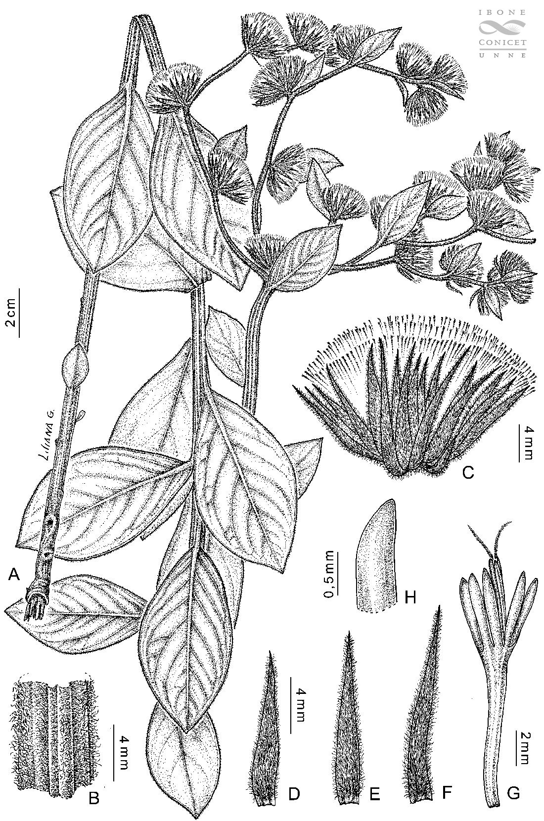 A. Planta. B. Detalle del tallo. C. Capítulo. D. Filario externo. E. Filario intermedio. F. Filario interno. G. Corola con detalle de las anteras y el ápice del estilo. H. Ápice del lóbulo de la corola, vista dorsal.