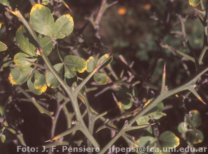 Arbusto de 1-5 m de alto, caducifolio, glabro; ramas tortuosas y verdosas con espinas axilares punzantes, de 1-2 cm de largo, verdes. Hojas con pecíolo de 1-2,4 cm de largo, levemente alado; láminas 3-folioladas, de 3-5 × 3,5-6,2 cm; folíolos obovados a elípticos, de 2-6 × 3-6,5 cm, base oblicua, ápice agudo, margen crenulado, los laterales asimétricos, caedizas. Flores perfectas, 5-meras, apareciendo antes que las hojas, solitarias o en pares, axilares, blancas y fragantes; sépalos cortos; pétalos espatulados, largos, caducos; estambres 20-60, diadelfos, libres entre sí, desiguales; disco intraestaminal presente; ovario globoso, 6-8 locular,sincárpico, con 4-8 óvulos en cada lóculo, axilares, en 2 hileras; estilo corto, estigma capitado. Fruto un hesperidio, globoso, de 2,8-4,6 cm de diámetro; epicarpo pubescente, amarillo-anaranjado. Semillas exalbuminadas, a menudo con varios embriones desiguales entre sí.