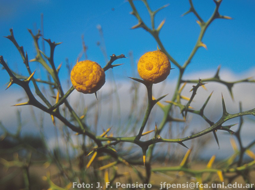 Arbusto de 1-5 m de alto, caducifolio, glabro; ramas tortuosas y verdosas con espinas axilares punzantes, de 1-2 cm de largo, verdes. Hojas con pecíolo de 1-2,4 cm de largo, levemente alado; láminas 3-folioladas, de 3-5 × 3,5-6,2 cm; folíolos obovados a elípticos, de 2-6 × 3-6,5 cm, base oblicua, ápice agudo, margen crenulado, los laterales asimétricos, caedizas. Flores perfectas, 5-meras, apareciendo antes que las hojas, solitarias o en pares, axilares, blancas y fragantes; sépalos cortos; pétalos espatulados, largos, caducos; estambres 20-60, diadelfos, libres entre sí, desiguales; disco intraestaminal presente; ovario globoso, 6-8 locular,sincárpico, con 4-8 óvulos en cada lóculo, axilares, en 2 hileras; estilo corto, estigma capitado. Fruto un hesperidio, globoso, de 2,8-4,6 cm de diámetro; epicarpo pubescente, amarillo-anaranjado. Semillas exalbuminadas, a menudo con varios embriones desiguales entre sí.