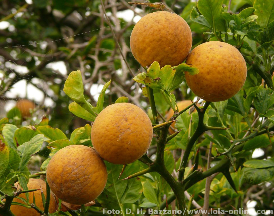 Arbusto de 1-5 m de alto, caducifolio, glabro; ramas tortuosas y verdosas con espinas axilares punzantes, de 1-2 cm de largo, verdes. Hojas con pecíolo de 1-2,4 cm de largo, levemente alado; láminas 3-folioladas, de 3-5 × 3,5-6,2 cm; folíolos obovados a elípticos, de 2-6 × 3-6,5 cm, base oblicua, ápice agudo, margen crenulado, los laterales asimétricos, caedizas. Flores perfectas, 5-meras, apareciendo antes que las hojas, solitarias o en pares, axilares, blancas y fragantes; sépalos cortos; pétalos espatulados, largos, caducos; estambres 20-60, diadelfos, libres entre sí, desiguales; disco intraestaminal presente; ovario globoso, 6-8 locular,sincárpico, con 4-8 óvulos en cada lóculo, axilares, en 2 hileras; estilo corto, estigma capitado. Fruto un hesperidio, globoso, de 2,8-4,6 cm de diámetro; epicarpo pubescente, amarillo-anaranjado. Semillas exalbuminadas, a menudo con varios embriones desiguales entre sí.