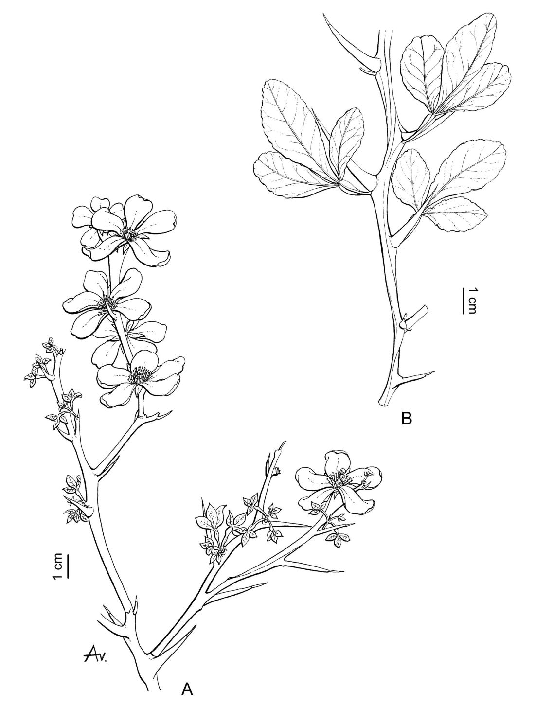 Arbusto de 1-5 m de alto, caducifolio, glabro; ramas tortuosas y verdosas con espinas axilares punzantes, de 1-2 cm de largo, verdes. Hojas con pecíolo de 1-2,4 cm de largo, levemente alado; láminas 3-folioladas, de 3-5 × 3,5-6,2 cm; folíolos obovados a elípticos, de 2-6 × 3-6,5 cm, base oblicua, ápice agudo, margen crenulado, los laterales asimétricos, caedizas. Flores perfectas, 5-meras, apareciendo antes que las hojas, solitarias o en pares, axilares, blancas y fragantes; sépalos cortos; pétalos espatulados, largos, caducos; estambres 20-60, diadelfos, libres entre sí, desiguales; disco intraestaminal presente; ovario globoso, 6-8 locular,sincárpico, con 4-8 óvulos en cada lóculo, axilares, en 2 hileras; estilo corto, estigma capitado. Fruto un hesperidio, globoso, de 2,8-4,6 cm de diámetro; epicarpo pubescente, amarillo-anaranjado. Semillas exalbuminadas, a menudo con varios embriones desiguales entre sí.