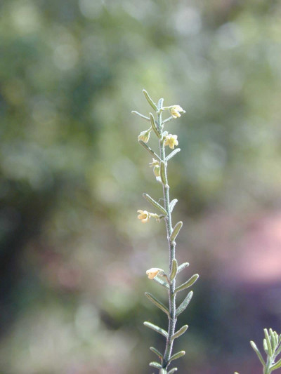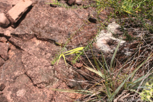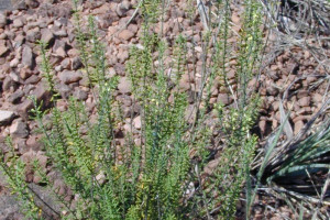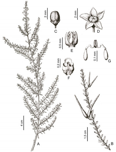 Subarbusto multicaule, ramoso, provisto de xilopodio subterráneo; ramas erectas y ascendentes, de 30-50 cm de alto, pubérulas. Hojas opuestas o en verticilos 3-meros, lineales a aciculares, de 0,8-1,2 × 0,1 cm, subsésiles, rectas o curvas, agudas y mucronadas, coriáceas, cortamente hirsuto-pubérulas, con el margen marcadamente revoluto y la cara abaxial, reducido a un surco angosto. Inflorescencias umbeliformes, extraaxilares, con 2-5 flores, pedúnculo de menos de 2 mm de largo, pubérulo, bractéolas angostamente triangulares, de menos de 0,5 mm de largo. Flores con pedicelos de menos de 2 mm de largo; cáliz con lóbulos oblongos, de menos de 1 mm de largo, agudos, pubérulos; corola subrotácea, amarillo-verdosa, lóbulos oblongos, de 1,5-2 mm de largo, semierectos, pubérulos; corona profundamente 5-lobada, doble, compuesta por 5 segmentos lanceolados que nacen de la base de las anteras, ca. 0,5 mm de alto, cada uno con un segmento más corto y más angosto inserto del lado ventral; cabeza estilar engrosada, plana, umbonada; retináculo angostamente oblongo, de 0,1 mm de largo, caudículas y polinios de la misma longitud. Folículos fusiformes, de 2-3 × 0,5 cm, simples o dobles, base ensanchada, agudos, placenta filiforme. Semillas 2-4 por folículo, de contorno oblongo-obovado, de 3 × 1,5 mm, comosas, sin reborde, finamente verrucosas, el margen crenulado.