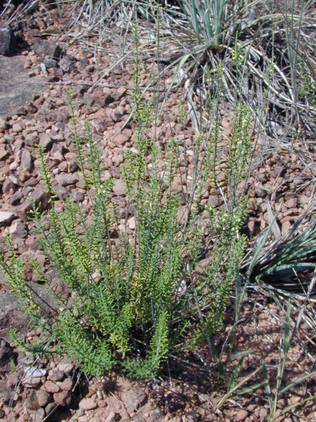 Subarbusto multicaule, ramoso, provisto de xilopodio subterráneo; ramas erectas y ascendentes, de 30-50 cm de alto, pubérulas. Hojas opuestas o en verticilos 3-meros, lineales a aciculares, de 0,8-1,2 × 0,1 cm, subsésiles, rectas o curvas, agudas y mucronadas, coriáceas, cortamente hirsuto-pubérulas, con el margen marcadamente revoluto y la cara abaxial, reducido a un surco angosto. Inflorescencias umbeliformes, extraaxilares, con 2-5 flores, pedúnculo de menos de 2 mm de largo, pubérulo, bractéolas angostamente triangulares, de menos de 0,5 mm de largo. Flores con pedicelos de menos de 2 mm de largo; cáliz con lóbulos oblongos, de menos de 1 mm de largo, agudos, pubérulos; corola subrotácea, amarillo-verdosa, lóbulos oblongos, de 1,5-2 mm de largo, semierectos, pubérulos; corona profundamente 5-lobada, doble, compuesta por 5 segmentos lanceolados que nacen de la base de las anteras, ca. 0,5 mm de alto, cada uno con un segmento más corto y más angosto inserto del lado ventral; cabeza estilar engrosada, plana, umbonada; retináculo angostamente oblongo, de 0,1 mm de largo, caudículas y polinios de la misma longitud. Folículos fusiformes, de 2-3 × 0,5 cm, simples o dobles, base ensanchada, agudos, placenta filiforme. Semillas 2-4 por folículo, de contorno oblongo-obovado, de 3 × 1,5 mm, comosas, sin reborde, finamente verrucosas, el margen crenulado.
