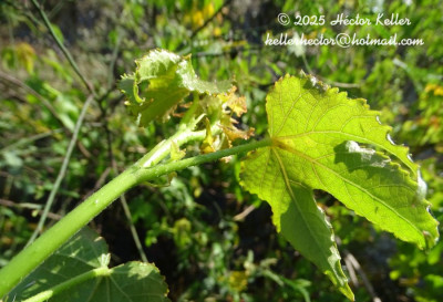 Arbusto de 1,5 a 3 m de altura, apoyante, a veces trepador, llegando a 5 m, con aculéolos en tallo y hojas y con follaje oscuro. Tallo subglabro, con líneas longitudinales de pelos pequeños, recurvos, muy abundantes y con aculéolos retrorsos, menores a 1 mm de largo, espaciados. Estípulas hasta de 5 mm de largo, lanceoladas, ciliadas. Pecíolo hasta de 9 cm de largo, con una línea en la cara superior, de pelos pequeños, abundantes y con numerosos aculéolos retrorsos en la cara inferior. Lámina de 11 × 13 cm, de base cordada con seno hasta de 2 cm de profundidad, 3-5-lobada, con el lóbulo medio usualmente angostado hacia la base y de ápice acuminado, con margen dentado-aserrado; hacia el ápice florífero, las hojas disminuyen sensiblemente de tamaño , reduciéndose a unos pocos centímetros y a veces de forma lanceolada; ambas caras con nervios hasta tercer grado visibles; epifilo con escamas muy pequeñas, blanquecinas con centro oscuro, además pelos glandulares punctiformes y pelos simples, rígidos, 1 mm de largo, principalmente en los nervios; hipofilo con indumento similar al del epifilo, pero con aculéolos retrorsos, de 0,5 mm de largo, en los nervios principales; nectario solitario, 2-3 mm de largo , en la base del nervio medio. Inflorescencias terminales paucifloras. Pedúnculos de 1-1,5 cm de largo, en antesis, hasta 3,5 cm en fruto, articulado más o menos en el medio, estrellado-pubescente hacia la base y hacia arriba híspido, con pelos hasta de 2 mm de largo, de base ensanchada. Calículo de 10 bractéolas de 20 a 25 mm de largo, en la antesis, notablemente bifurcadas y densamente híspidas, con pelos de 2 mm de largo. Cáliz de 15 mm de largo, en la antesis, con lóbulos 9 × 5 mm, con escamas y pelos glandulares punctiformes y con pelos simples o bifurcados, hasta de 2,5 mm de largo, de base ensanchada; nectarios ubicados en la mitad de los lóbulos; cáliz acrescente, hasta de 22 mm de largo, en el fruto, reticulado. Corola rosada con la base purpúrea, 7-9 cm de largo. Columna estaminal púrpura, 4 cm de largo. Los estigmas apenas sobrepasan al tubo estaminal. Fruto oblongo en corte longitudinal, 20 × 15 mm, con una capa de pelos pequeños estrellados y con pelos simples, de 1,5-2 mm de largo, adpreso s y antrorsos. Semillas angulosas, de 4 mm de largo, estriadas, con escamas pequeñas, pectinadas.