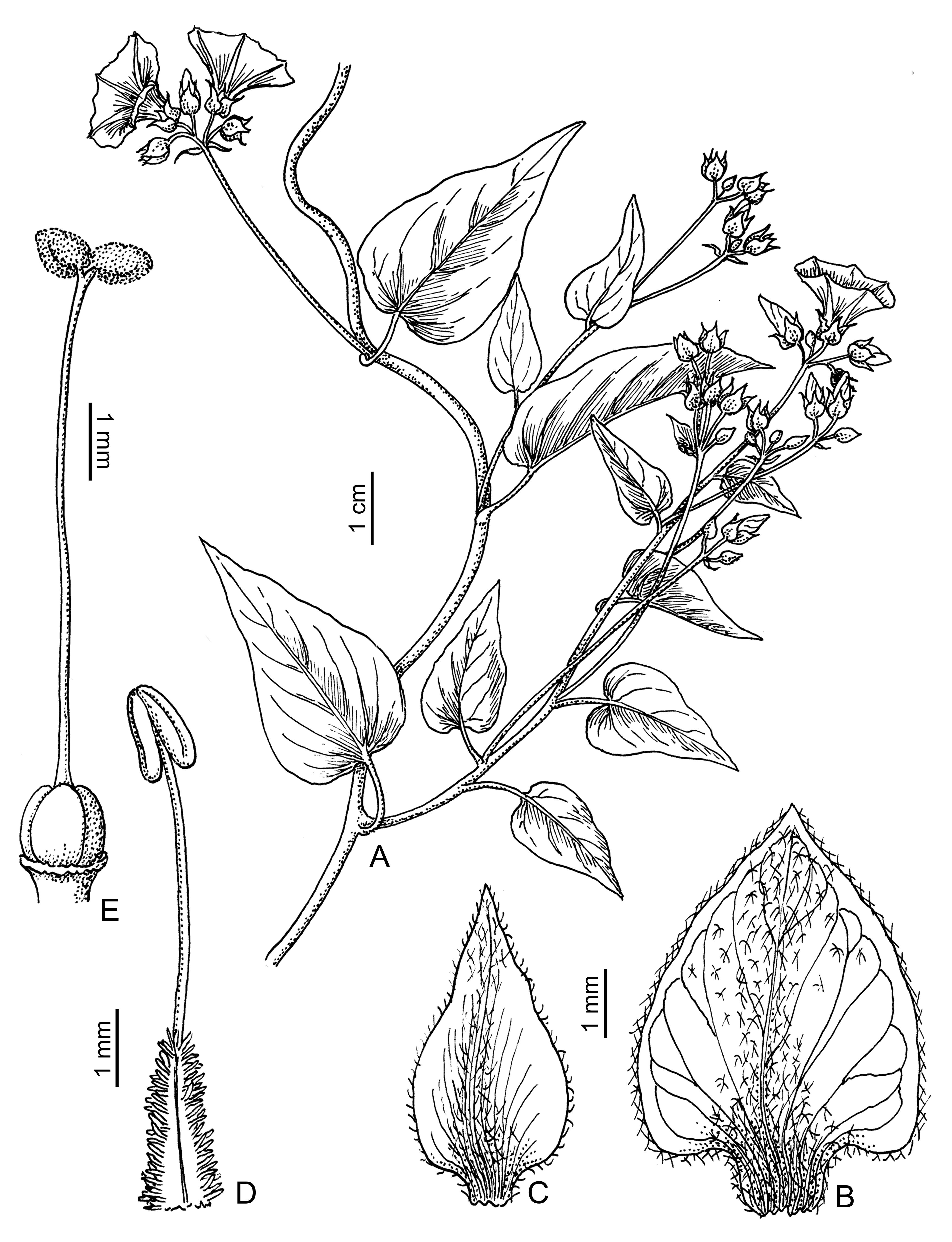 Enredaderas con ramas cilíndricas, de 1-4 mm, tomentosas a pubescentes, con pelos 3-radiados. Hojas pecioladas, ovadas, ovado-lanceoladas o raro suborbiculares, de 1,5-12 × 1-8 cm, bordes lisos o apenas sinuados; base cordada, subcordada o subtruncada, con seno generalmente ancho y poco profundo; ápice agudo a acuminado; haz con pubescencia esparcida, envés glabro o piloso en los bordes y sobre las nervaduras. Inflorescencia en cimas 320-floras, con las primeras ramificaciones dicasiales y las siguientes monocasiales; pedúnculos de 1-10 cm de largo, pubescentes; brácteas florales lineares o lanceoladas, de 4-10 mm de largo. Flores con sépalos exteriores subrómbicos u ovados, acuminados, de ± 6 × 3,2 mm, atenuados hacia la base, mucronados, pilosos en toda su superficie o solo en la línea media y los bordes, los interiores ovadolanceolados, de ± 4 × 2,5 mm, largamente acuminados, glabros o pilosos en el ápice; corola campanulada, blanca, celeste o violácea, de 6-10 mm de largo, con algunos pelos en los extremos de las áreas mesopétalas; estambres de 4-6 mm, filamentos con pelos glandulares; estilo de 5-6,5 mm. Cápsula subglobosa, ca. 3-4 mm de diám., rodeada por los sépalos. Semillas ocráceas, de ± 2,5 mm, finamente muricadas o rugosas y generalmente con un ala ondulada en los bordes.