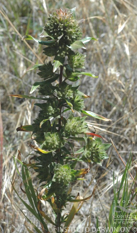 Hierba anual hasta de 60 cm de alto, con los tallos erectos, simples o ramificados, pubescentes. Hojas lineares o linear-lanceoladas, de 7 × 1 cm, alternas, de ápice agudo, borde entero o levemente sinuado, glabras o pubescentes, márgenes con pubescencia retrorsa, sésiles o cortamente pecioladas. Inflorescencias en cabezuelas terminales, axilares o terminales, brácteas lanceoladas a ovadas con abundantes pelos glandulares en ambas superficies. Flores con cáliz 5-lobulado, de 7-10 mm de largo, glandular, de tubo estrecho y de longitud similar a la de los lóbulos, éstos estrechamente triangulares; corola con tubo 13-17 mm de largo, con 5 lóbulos ovado-elípticos, de 10 mm de largo, glanduloso-pubescentes en la cara externa y glabros en la cara interna, anaranjado-blanquecinos; anteras púrpuras, polen azul. Fruto una cápsula hemisférica, de 3 × 3 mm, glabra. Semillas ovoides, ca. 1,5 mm de largo, con reborde superior, oscuras.