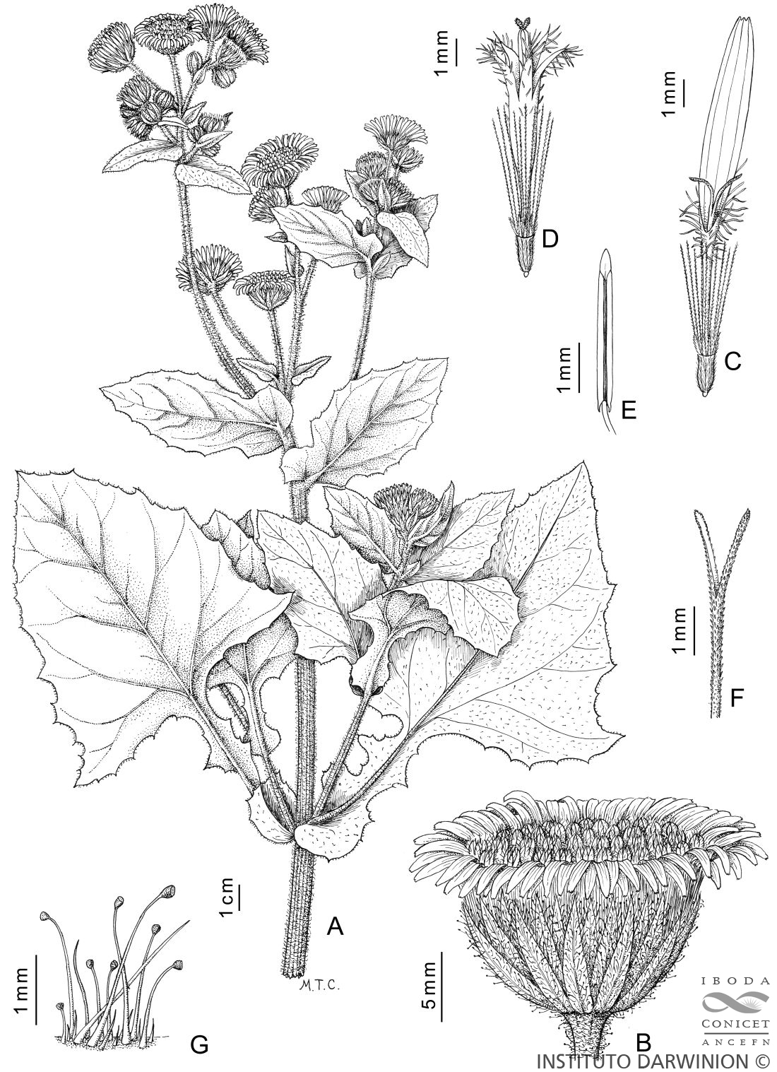 A. Rama florífera. B. Capítulo. C. Flor del margen. D. Flor del centro. E. Estambre. F. Parte superior del estilo de la flor del centro. G. Pubescencia foliar y caulinar.