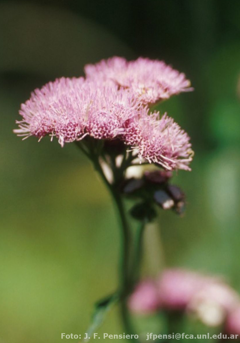 Hierbas perennes de 0,5-1,5 m de alto, hojosas hasta la inflorescencia. Hojas pecioladas, las superiores alternas, las inferiores opuestas, ovado-lanceoladas o lanceoladas, de 3-9 × 1-2,5 cm, cuneiformes en la base, aserradas, pubescentes en ambas caras. Capítulos dispuestos en cimas corimbiformes densas. Involucro acampanado de 3-3,5 × 4 mm; filarios en 2 series, lanceolados, densamente pubescentes en el dorso. Receptáculo hemisférico. Flores 30-40 corolas, liláceas o violáceas, de 2,5 mm de largo. Aquenios negros, glandulíferos, de 1,2-1,5 mm de largo. Papus blanco.