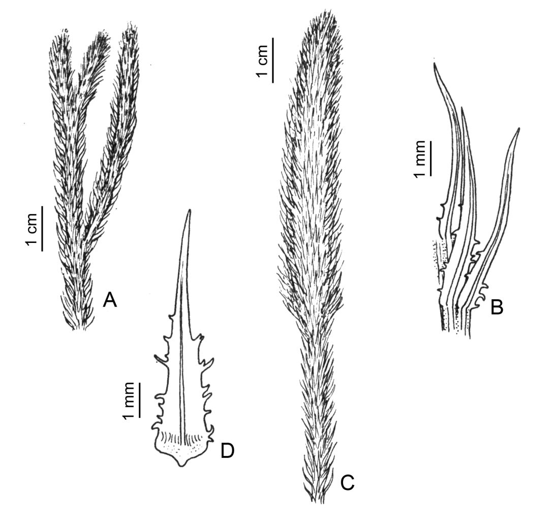 A. Eje vegetativo rastrero. B. Licofilos del eje vegetativo rastrero. C. Estróbilo. D. Esporofilo. Tomado de Bradea 5: 39, fig. 4A. 1987.