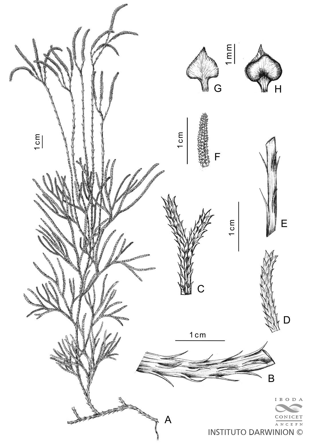 A. Planta. B. Porción de un eje postrado. C. Porción de un eje erecto, cara ventral. D. Porción de un eje erecto, cara dorsal. E. Porción de un pedúnculo estrobilar. F. Mitad terminal de un estróbilo. G-H. Esporofilo, caras dorsal y ventral respectivamente.
