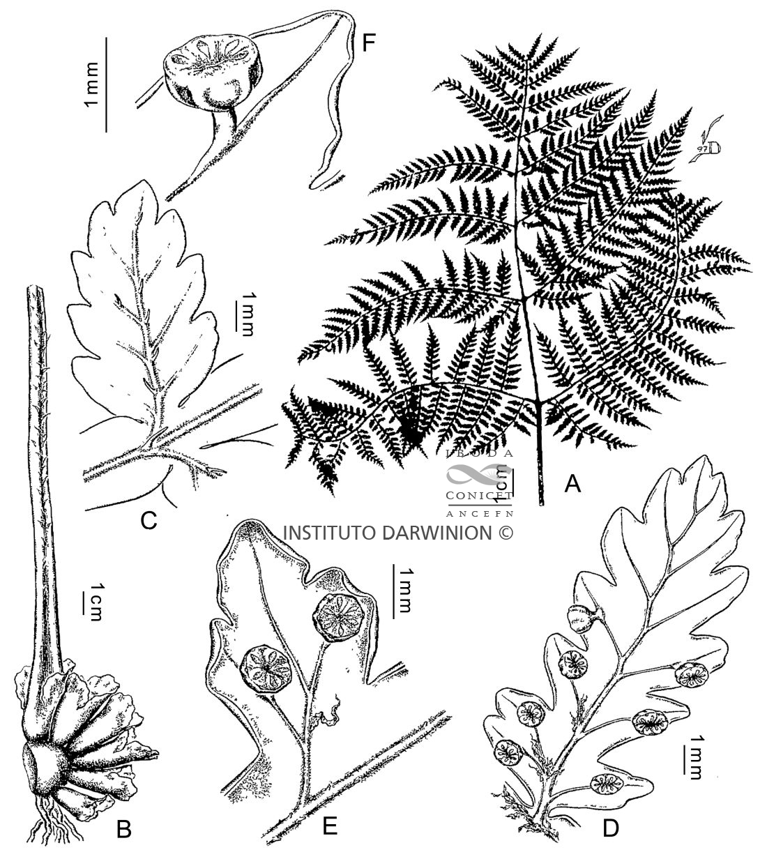 A. Fronde. B. Rizoma y base del pecíolo. C. Pínnula, cara adaxial, con aristas costales. D. Pínnula fértil, cara abaxial. E. Segmentos con sinangios, escama sobre la cóstula y tricomas cónicos sobre la costa. F. Detalle de un sinangio.