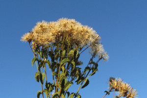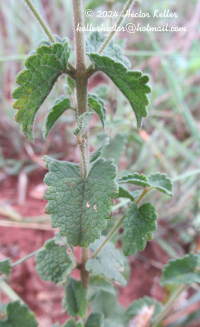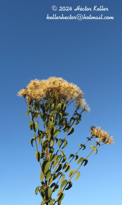 Subarbustos con xilopodio del que nacen tallos erectos hasta de 1 m de alto, pubescentes. Hojas brevemente pecioladas, lámina péndulas, acorazonadas, de 2-3 × 1,5-2 cm, crenadas, hirsutas en ambas caras y con puntuaciones glandulíferas. Capítulos numerosos dispuestos en cimas corimbiformes, formando un corimbo compuesto de cimas, pedúnculos pubescentes. Involucro cilíndrico de 4-8 × 1,5-2 mm; filarios fácilmente caedizos, en 4-5 series, imbricados, gradualmente más cortos, redondeados o triangulares y pubérulos en el ápice y con 3-5 surcos en el dorso. Receptáculo plano. Flores 5-8(-10) corolas, ca. 2,5 mm de largo. Aquenios glabros, ca. 3 mm de largo. Papus estramíneo.