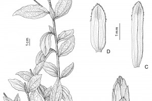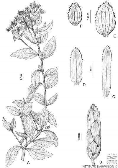 Arbustos ca. 1,5 m de alto, con ramas escabroso-pubescentes, hojosas hasta el ápice. Hojas brevemente pecioladas, láminas ovado-lanceoladas, de 5-9 × 2-3 cm, agudas o semiobtusas y deltoides o casi redondeadas en la base, enteras o con 1-3 dientes a cada lado, papiráceas, laxamente pubescentes en el envés. Capítulos numerosos dispuestos en cimas corimbiformes densas, pedúnculos pubescentes. Involucro cilíndrico, de 10-12 × 3-4 mm; filarios fácilmente caedizos, en 7-9 series apretadas, gradualmente más cortos, los exteriores elípticos, los interiores oblongos, redondeados y cortamente ciliados en el ápice, glabros en el dorso. Receptáculo plano. Flores 15-23, corolas lilacinas, de 6 mm de largo. Aquenios escabrosos en los ángulos, de 4 mm de largo. Papus blancuzco.