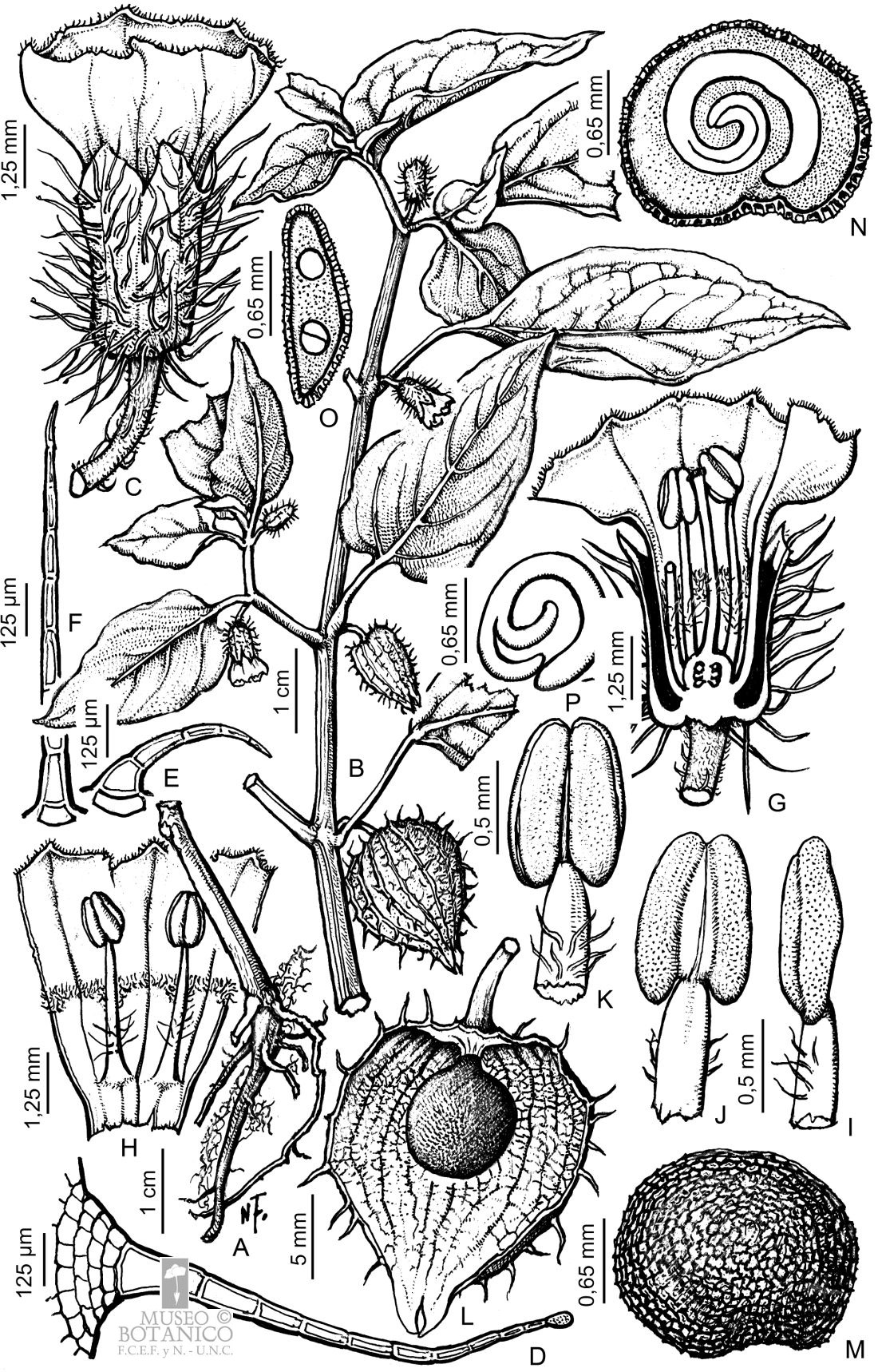 A. Raíz. B. Rama con flores y frutos. C. Flor. D. Tricoma glandular con base pluricelular prominente del cáliz. E-F. Tricomas eglandulares del cáliz. G. Flor, corte longitudinal. H. Sector de corola desplegada. I. Estambre, vista lateral. J. Estambre, vista dorsal. K. Estambre, vista ventral. L. Fruto y cáliz en corte longitudinal. M. Semilla. N. Semilla, corte longitudinal. O. Semilla, corte transversal. P. Embrión.