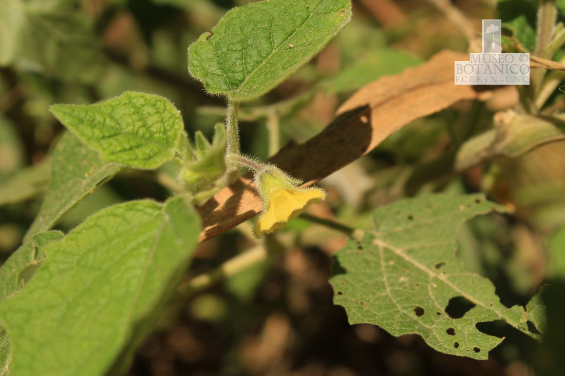 Hierbas anuales, erectas, de 20-65 cm de alto, con abundantes tricomas simples, glandulares, hasta de 1,5 mm. Pecíolos de 1-4 cm; láminas subcirculares a ovadas, de 3-8 × 2-5 cm, base truncada, margen dentado (con 3-8 pares de dientes). Flores péndulas y pequeñas; pedicelos breves, generalmente curvos, de 3,5-4,5 mm; cáliz de 2,5-4 mm, superando apenas la altura media de la corola, pubescente, con tricomas glandulares caducos en la fructificación, lóbulos triangulares, de 0,75-1,5 × ca. 1 mm; corola acampanada, de 4-7 mm × ca. 3 mm de diámetro, amarillo-clara con 5 máculas muy tenues de color verdoso, borde superior 10-lobulado, los 5 lóbulos menores pilosos e irrigados por el nervio central y los otros 5, comisurales, glabros, de mayor tamaño, profundamente emarginados, tubo con un anillo de tricomas simples y ramificados en su borde superior; estambres con filamentos pubescentes de 1,5-2,8 mm, petalostemos pubescentes ca. 0,5 mm de alto, anteras amarillas de 0,8-1,2 mm; gineceo de 3,5-4,5 mm, ovario ovoide, ca. 0,5 mm de diámetro, estilo cilíndrico, ca. 2,5 mm, estigma levemente capitado. Baya pequeña, péndula, caduca, glabra, cremosa, de 6-8 mm de diámetro; pedicelos fructíferos arqueados de 4-6 mm; cáliz fructífero membranáceo, marcadamente 10-costado, glabrescente, de (15-) 18-25 mm; semillas amarillo claro, ca. 2 × 1,5 mm.