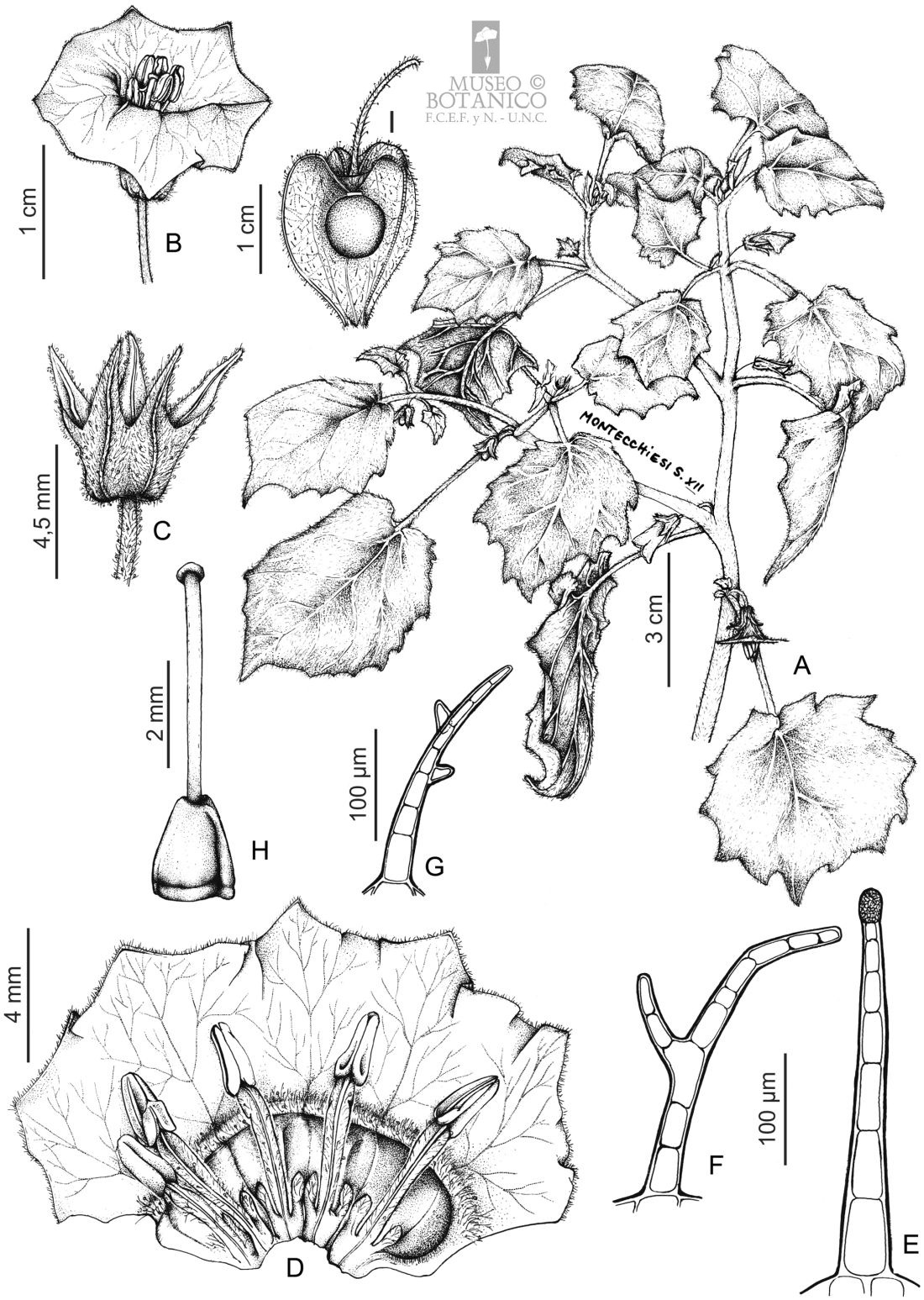 A. Rama florífera. B. Flor. C. Cáliz. D. Corola desplegada. E. Tricoma glandular del interior de la corola. F-G. Tricomas eglandulares del interior de la corola. H. Gineceo. I. Fruto.