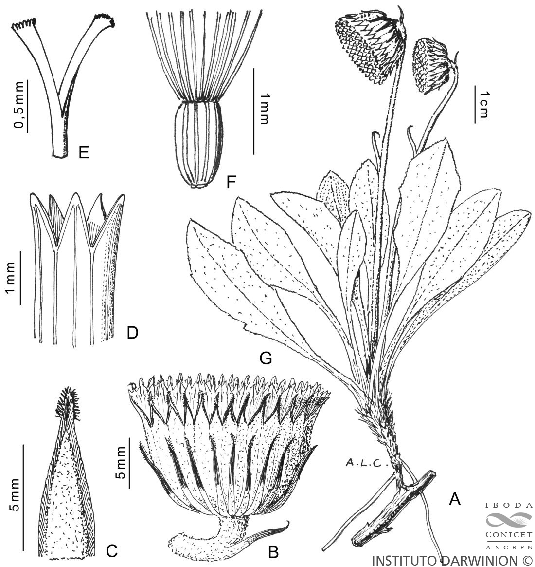 A. Planta. B. Capítulo. C. Filario. D. Ápice de la corola. E. Porción superior del estilo. F. Aquenio y papus.