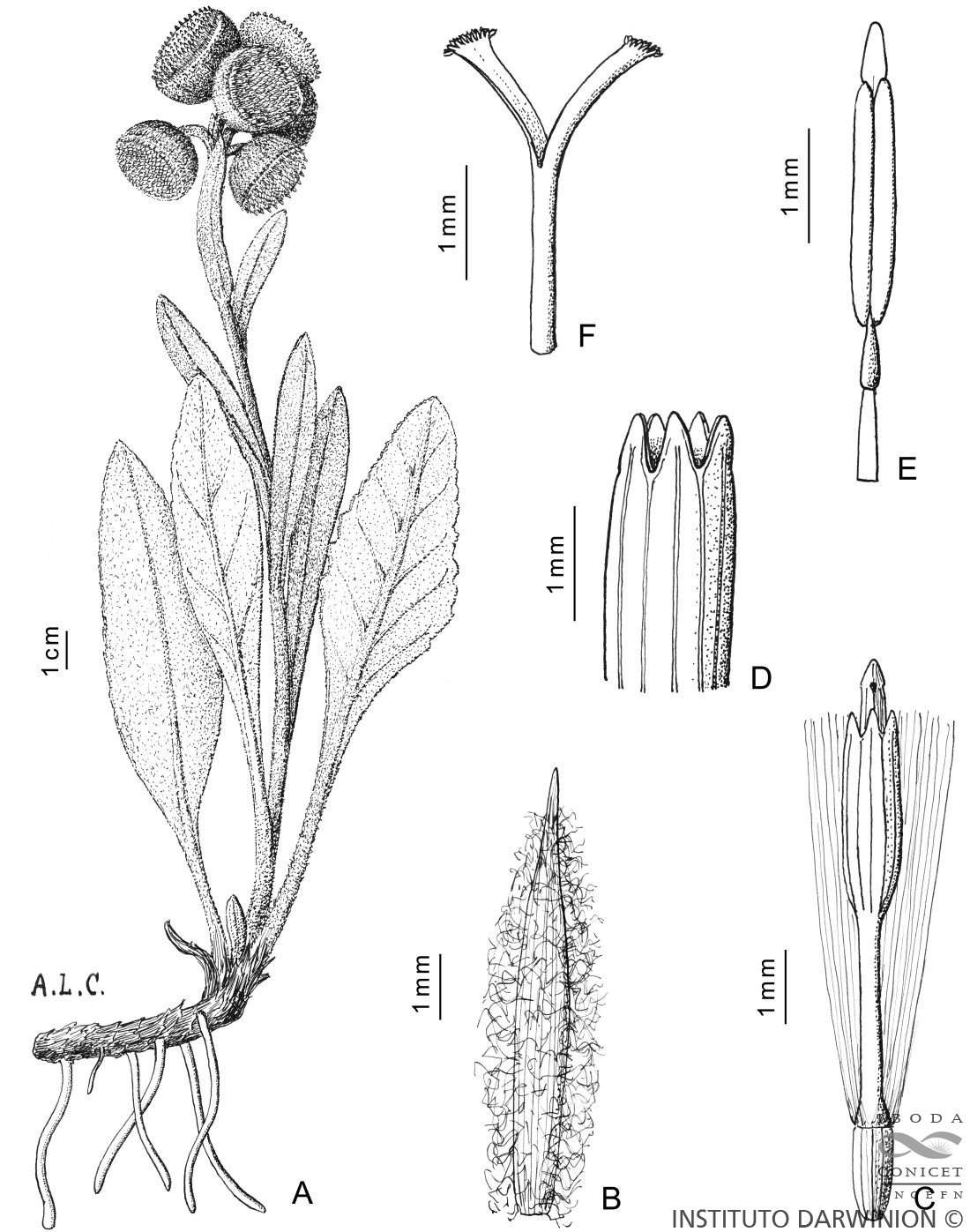 Hierbas perennes, de 20-30 cm de alto, densamente ocráceo-tomentosas; tallos simples, erectos. Hojas basales pecioladas; pecíolos envainadores de 7-8 cm de largo; láminas ovado-elípticas, de 6-10 × 2-4 cm, atenuadas en la base, obtusas en el ápice, menudamente crenadas en el margen, densamente ocráceo-tomentosas en ambas caras; hojas superiores distantes, sésiles, menores. Capítulos discoides, 2-8, nutantes, amontonados en una cima corimbiforme en el ápice del tallo; pedúnculos tomentosos, de 10-30 mm de largo. Involucro hemisférico, de 10-12 × 20-25 mm; brácteas del calículo muy numerosas, dispuestas en 2-3 series, lineares, densamente tomentosas, tan largas como el involucro; filarios ca. 30, linear-lanceolados, atenuados en el ápice, densamente tomentosos en el dorso. Flores isomorfas, muy numerosas, con corolas tubulosas, 5-lobadas, lóbulos triangulares, ca. 0,5 mm de largo. Aquenios cilindroides, costados, glabros. Papus blanco ca. 8 mm de largo