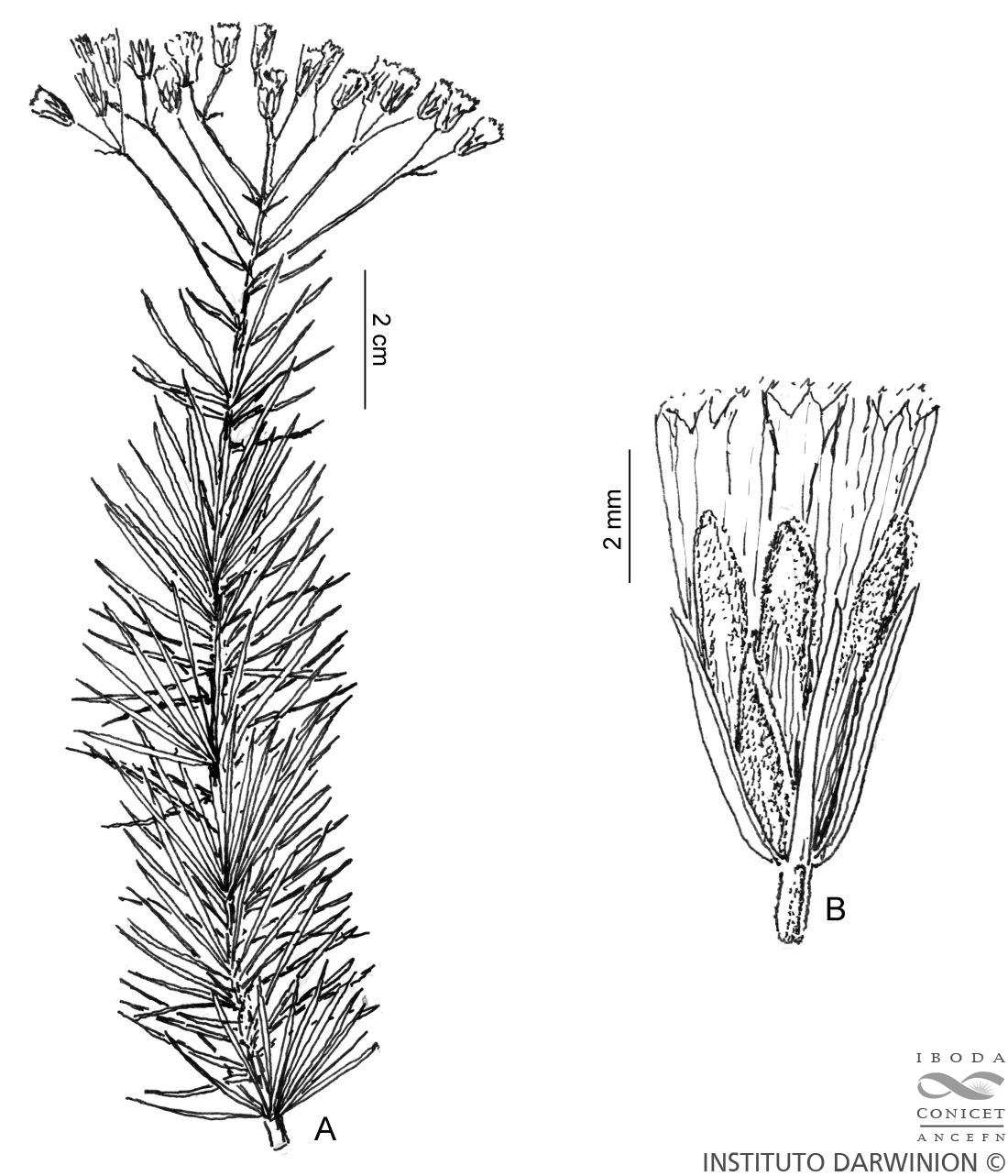 A. Parte superior de la planta. B. Capítulo. Tomado de Fl. Paraguay 25: 72, fig. 23. 1996.