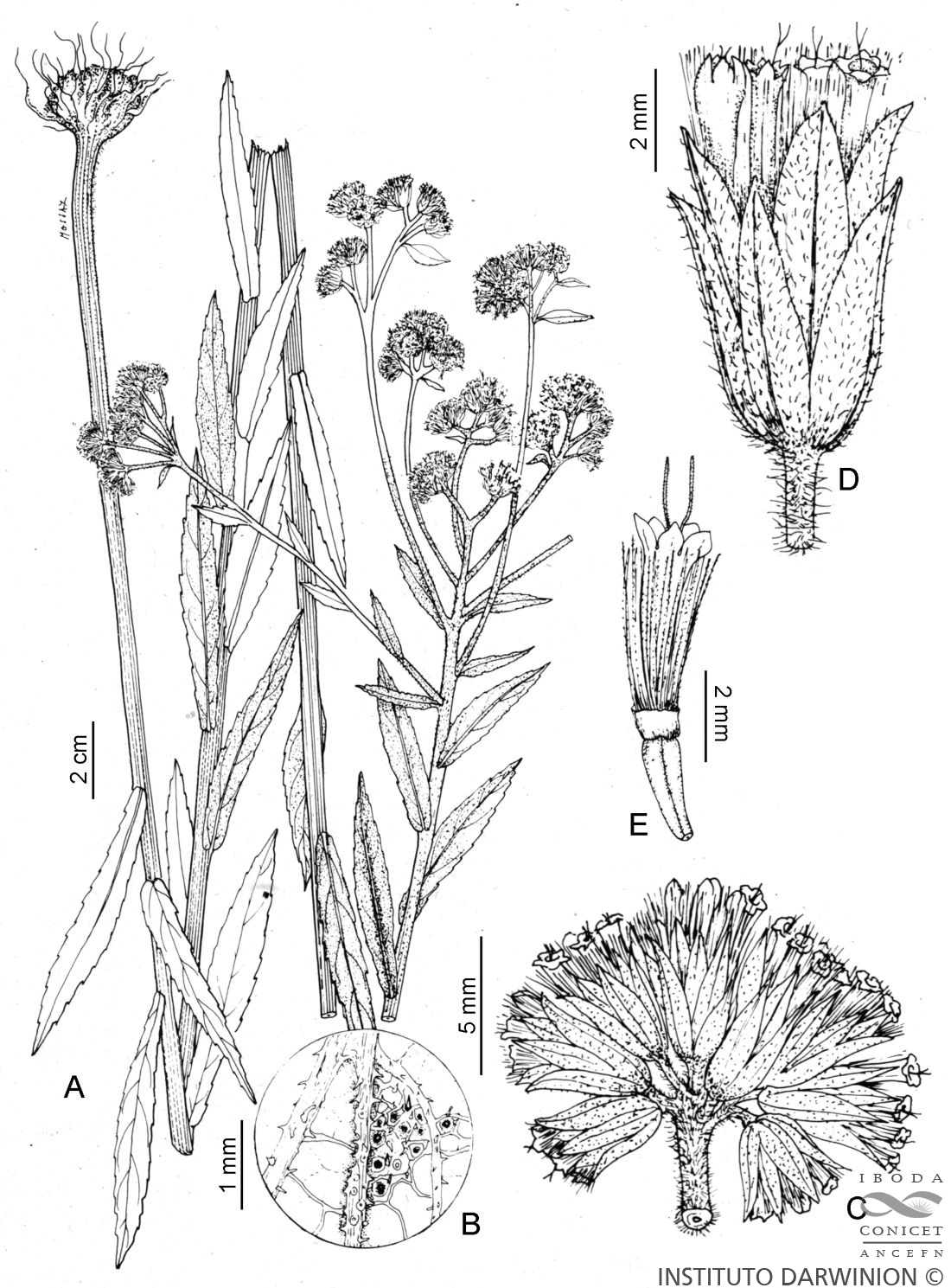 A. Planta. B. Epidermis foliar, detalle. C. Inflorescencia. D. Capítulo. E. Flor. Tomado de Fl. Paraguay 25: 158, fig. 59. 1996