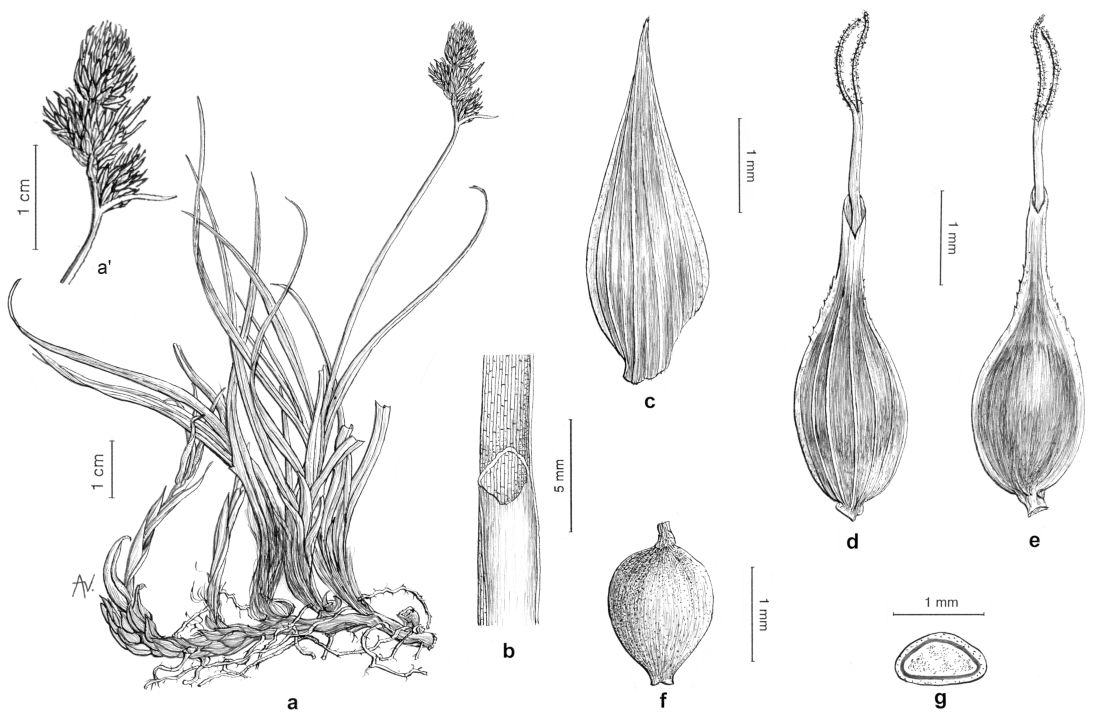 A. Planta. A'. Detalle de inflorescencia. B. Región ligular. C. Gluma de la flor pistilada. D. Utrículo, vista dorsal. E. Utrículo, vista ventral. F. Aquenio. G. Transección esquemática del aquenio.