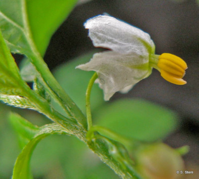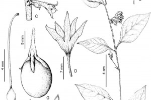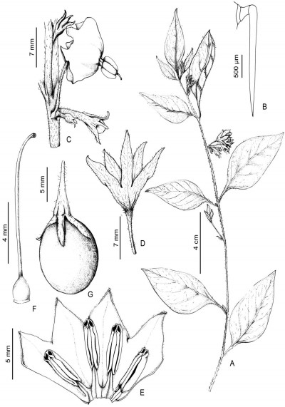 Hierbas, a veces sufrútices, con una o varias ramas, hasta de 40 cm de alto; tallos escasa a densamente pubescentes, con tricomas simples 2-celulares, normalmente geniculados, antrorsos, raramente patentes. Unidades simpodiales 2-foliadas, geminadas o no, cuando geminadas las hojas de igual tamaño. Pecíolos de 0,5-2,5 cm, con tricomas tectores geniculados iguales a los foliares; láminas elípticas a ovado-elípticas, de 1,5-7 × 1-3 cm, base redondeada a obtusa, ápice agudo, pubescentes en ambas caras, con tricomas 1- ó 2-celulares adpresos sobre la lámina y más abundantes sobre los nervios. Inflorescencia sésil a subsésil, 1-5-flora, eje con igual pilosidad que las ramas. Pedicelos de 0,5-1,5 cm; cáliz de 3-10 mm, tubo de 1-3 mm, lóbulos linear-lanceolados, de 2-7 × 0,5-1,5 mm, glabros adaxial y abaxialmente; corola rotácea, blanca, de 0,5-1,5 cm de diámetro, lóbulos triangulares diminutos, de 1-2 × 0,5-1 mm, glabros a glabrescentes adaxialmente; estambres de 2-4 mm, filamentos hasta de 1 mm, con un filamento 0,25-0,5 más largo que los restantes, anteras elipsoides, de 1,5-3 × 0,5-1,5 mm, base cordada y ápice emarginado; ovario glabro, estilo cilíndrico, de 4-6 mm, glabro, de igual longitud que los estambres o exerto, estigma capitado. Baya globosa, de 0,5-1,2 cm de diámetro, glabra, semitransparente cuando madura, castaña al secarse; pedicelos fructíferos de 1-2 cm; semillas 10-35 por fruto, ovoide-reniformes, ca. 2,5 × 1,5 mm, comprimidas, testa con foveolas poco profundas paralelas al margen, margen no engrosado.