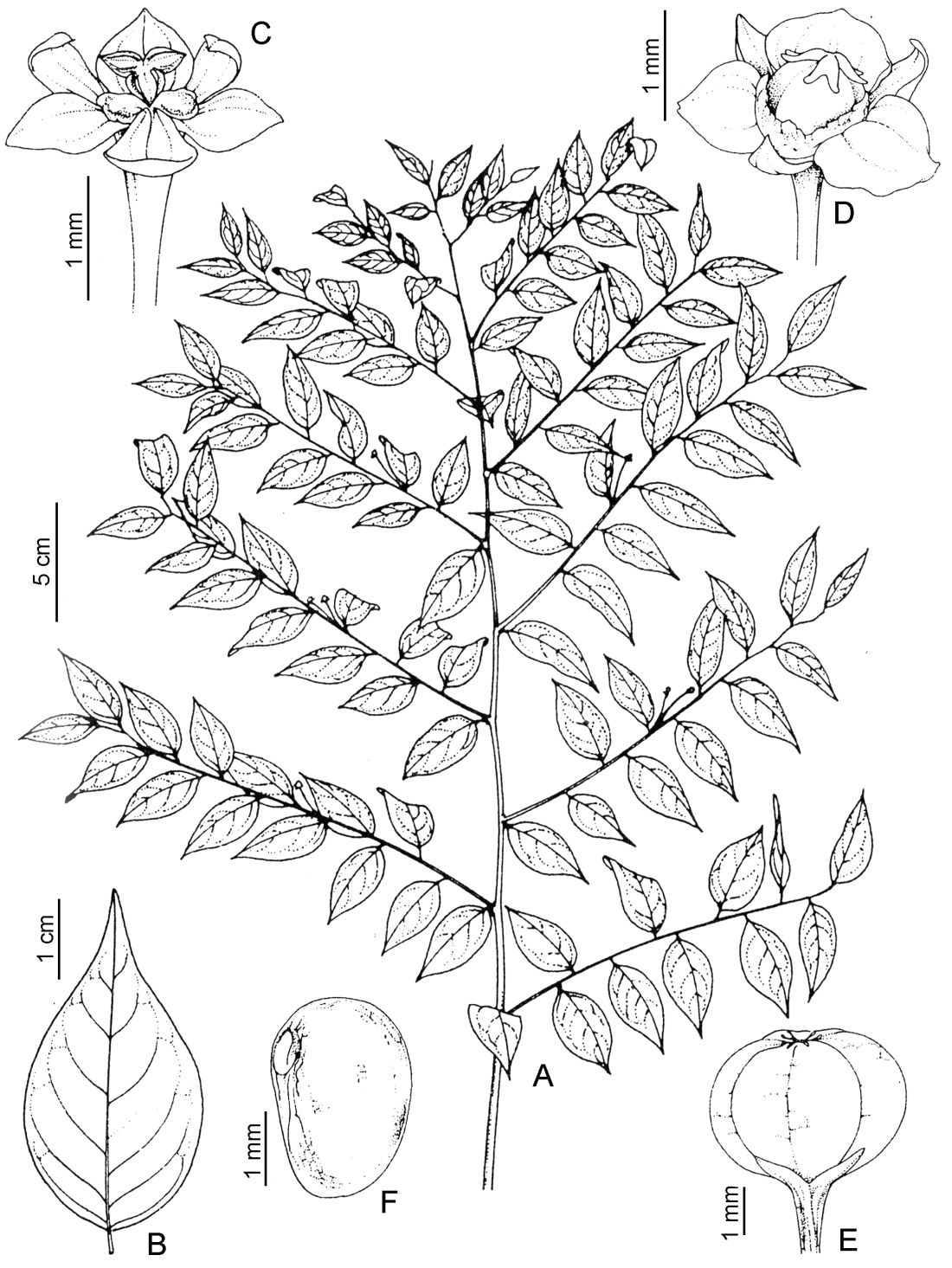 A. Rama florífera. B. Hoja. C. Flor estaminada. D. Flor pistilada. E. Fruto. F. Semilla. Tomado de Acta Bot. Bras. 21: 83, figs. 1-6. 2007.