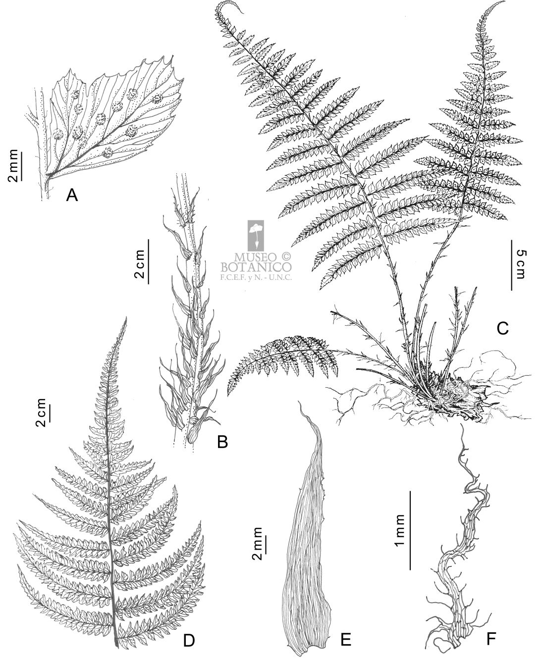 A. Pínnula, cara abaxial, mostrando la venación y posición de los soros. B. Porción basal del pecíolo con las escamas. C. Planta. D. Ápice de la fronde. E. Escama de la base del pecíolo. F. Escama del raquis. A, B, D, E, F Tomado de Condack 2012.