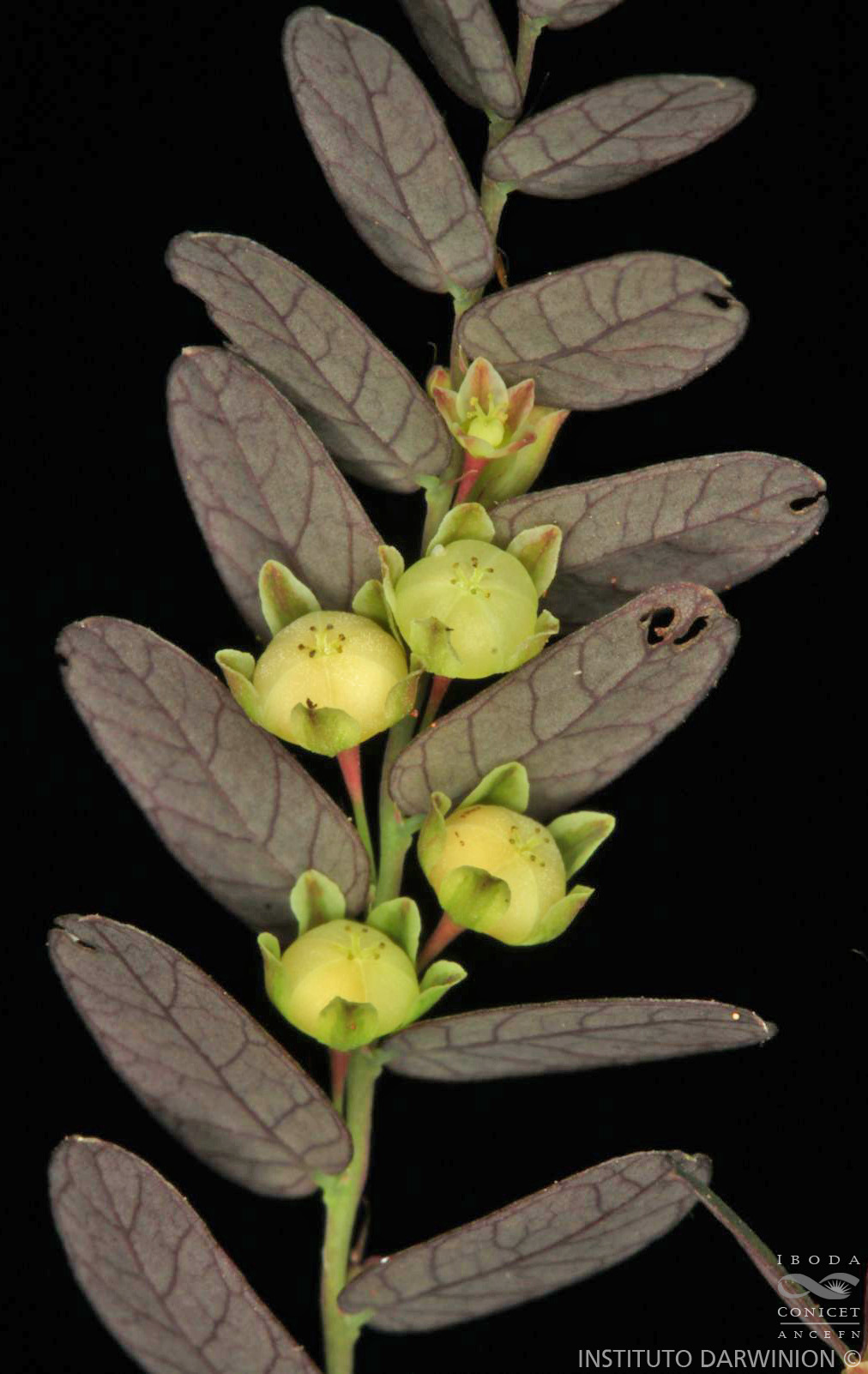 Hierbas o subarbustos, hasta de 40 cm de alto, glabros; tallos simples o generalmente ramificados en la parte superior; entrenudos inferiores hasta de 7 cm de largo, los superiores más cortos o cortísimos en las ramitas laterales, de 2-5 mm de largo. Hojas alternas, dísticas en las ramitas laterales (que alcanzan hasta 7 cm) con apariencia de hojas compuestas; pecíolos de 0,5-1 mm de largo; láminas oblongas, de 4-8 × 2-4 mm, de base y ápice obtuso, generalmente mucronadas, discoloras; estípulas ovado-lanceoladas a lanceoladas, de 1-1,4 mm de largo, acuminadas. Flores solitarias, axilares; pedúnculos de 1-3 mm de largo, engrosados en el ápice. Flores estaminadas con 5 sépalos oblongos o casi suborbiculares, obtusos; estambres 3, filamentos gruesos, soldados; glándulas 5, libres, ensanchadas en el ápice. Flores pistiladas con 5 sépalos oblongos, obtusos, verdosos, con el margen blanquecino; disco anular, lobulado; ovario subgloboso, 3-lobulado; estilos 3, 2-fidos. Cápsulas de 2,4-2,9 mm de diámetro, deprimidas, amarillentas o rojizas. Semillas subtetraédrlcas, ca. 1,5 mm de largo, amarillentas, con costillas longitudinales, finamente estriadas transversalmente