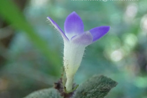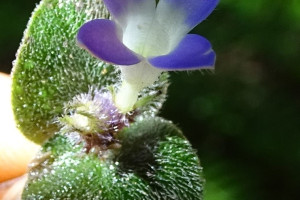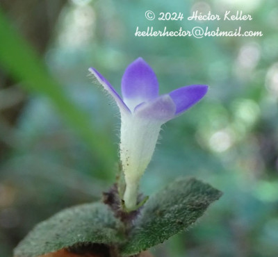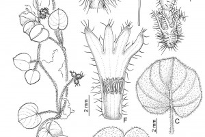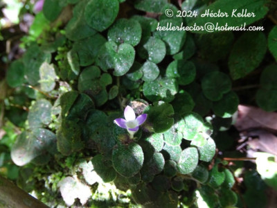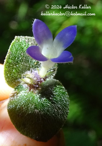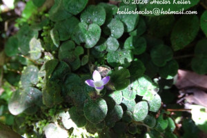 Hierba rastrera con tallos radicantes. Hojas con láminas orbiculares o suborbiculares, de (6,5-)10-20(-26) × 10-20(-25) mm, ápice obtuso y base leve o marcadamente cordada, discoloras, vináceas en el envés, con pelos adpresos en ambas caras, hirsutos sobre los nervios del envés, con 3-4 nervios secundarios, inconspicuos en cara adaxial; estípula con una fimbria subulada, con coléter apical, notable, y 2-3 coléteres en el borde interno de la vaina; pecíolo de (3,5-)10-20 mm de largo, hirsuto. Inflorescencia 2-3 flora. Flores con cáliz 4-lobado; hipanto globoso o subgloboso, con pelos hirsutos; lóbulos lineares, de 2-4 mm de largo, hirsutos; corola de 8-10 mm de largo, la superficie externa hirsuta, tubo blanco-verdoso con lóbulos violáceos o lilacinos; flor brevistila con anteras de 0,8-0,9 mm de largo, filamento de 0,2 mm de largo, estilo de 3,5-3,8 mm de largo; flor longistila no vista. Fruto una baya globosa o subglobosa, de 20-40 mm de largo, azul o rojo-vinosa, con lóculos 7-8 seminados. Semilla de 1,2-1,3 mm de largo, verrucosa.