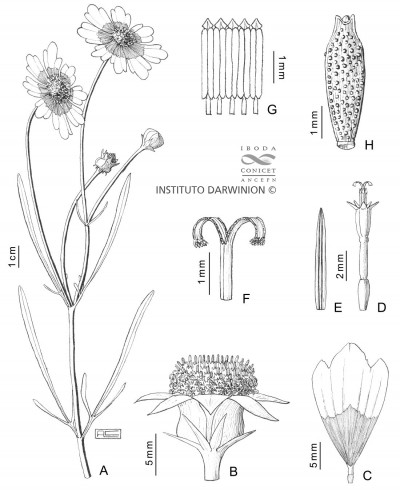 Hierbas anuales, de 60-90(-150) cm de alto, glabras, con tallos hojosos, algo ramosos. Hojas opuestas, sésiles o con pecíolo corto, pinnati- o bipinnatipartidas, de 1-6 × 0,5-2,5 cm, con segmentos lineares, las hojas superiores a veces enteras. Capítulos pocos, sobre pedúnculos de 1-5(-15) cm de largo, más o menos corimbosos. Involucro acampanado, de 7-9 mm de alto; filarios ca. 2-seriados, los externos linear-oblongos o triangulares, los internos deltoideos u oblongo-ovados. Receptáculo con páleas filiformes, rojizas. Flores del margen con lígulas obovadas, de 12-18 mm de largo, ápice 3-lobado, amarillas y con una mancha basal rojizo-purpúrea, las del centro tubulosas, de 2,5-3 mm de largo, rojizo-purpúreas. Aquenios linear-oblongos, de 1,5-4 mm de largo, comprimidos, oscuros, glabros o casi glabros, alas ausentes. Papus inconspicuo.
