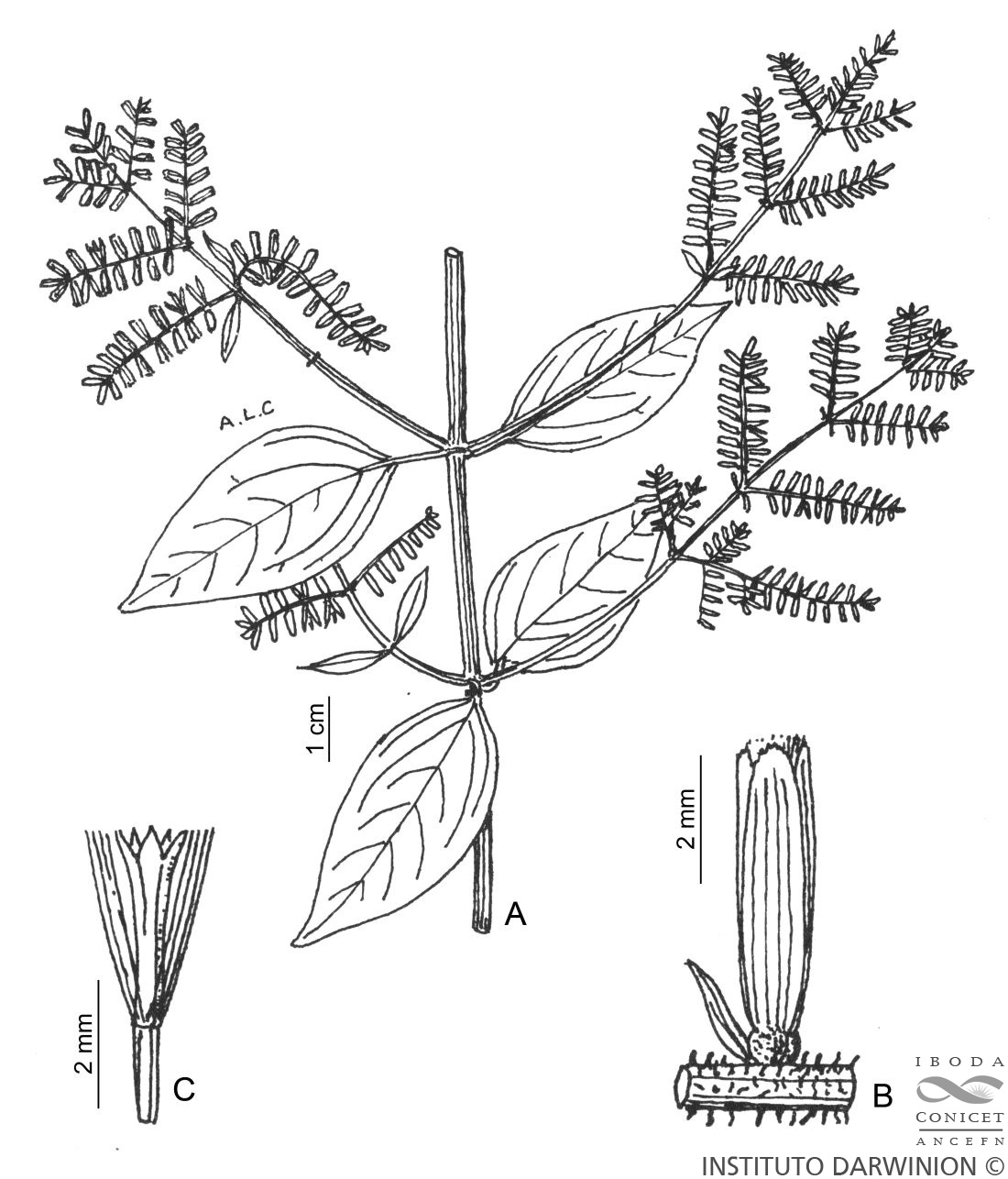 A. Rama florífera. B. Capítulo. C. Flor. Tomado de Fl. Il. Catarinense COMP 4: 668, fig. 160. 1989.
