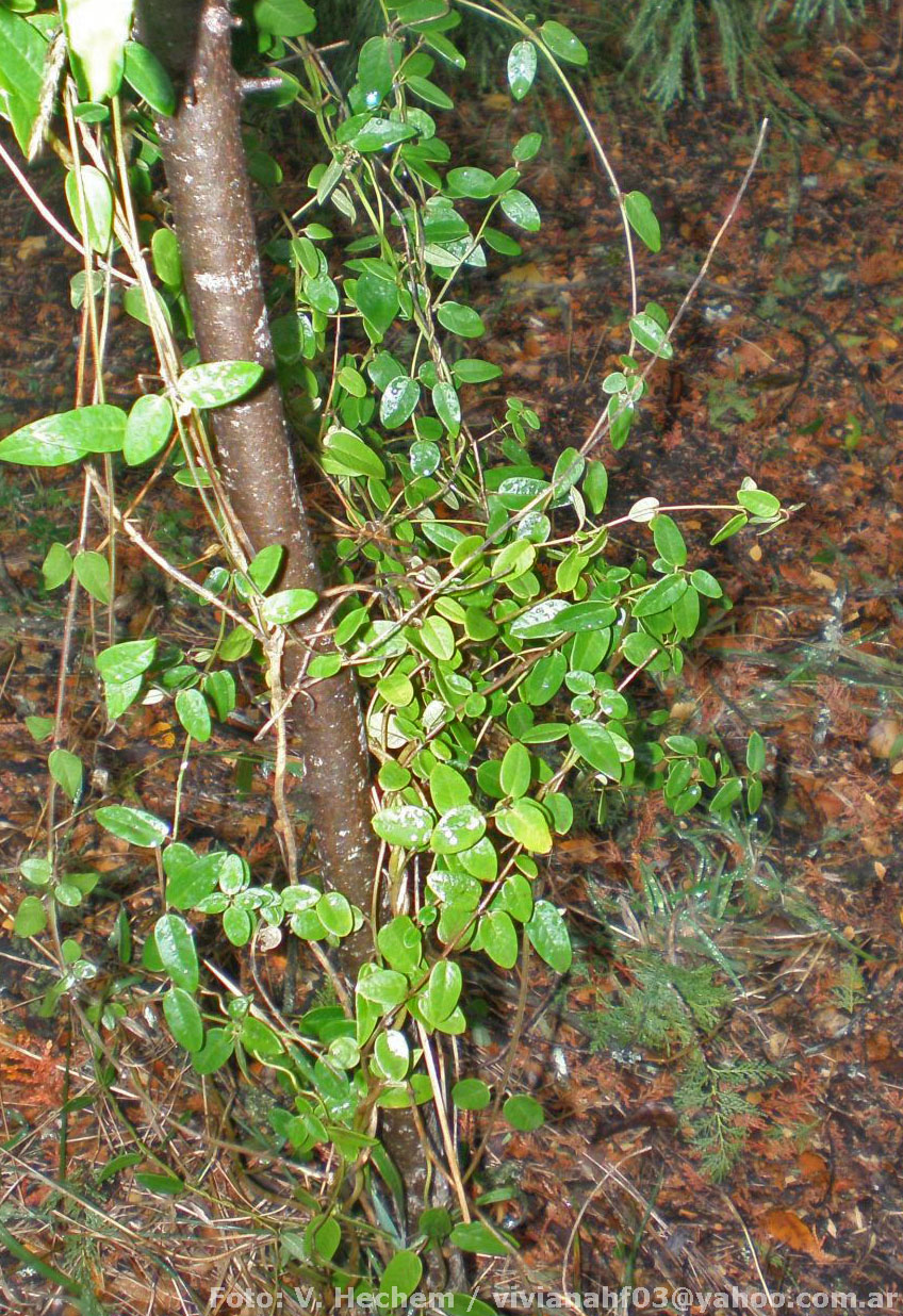 Especie de la Argentina, habita en la region septentrional de los bosques andino patagónicos desde el SO de Neuquén hasta el extremo NO de Chubut. Vegeta enredada sobre la vegetación en bordes y claros de bosque, especialmente de ciprés (Austrocedrus chilensis), entre los 250 y 800 m s.m., según la latitud. Florece en verano