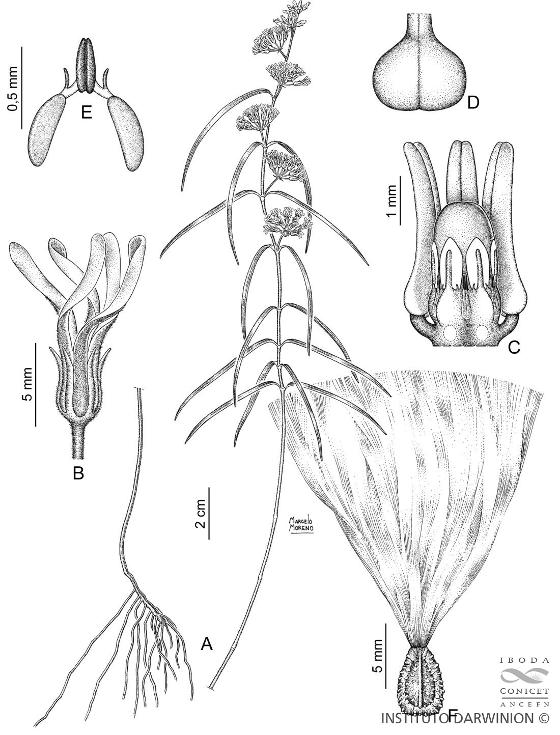 Hierba de 45-65 cm de alto, erecta, tallo no ramificado, pubescente. Hojas con pecíolo de 2-2,5 mm de largo, pubescente; lámina linear a linear-lanceolada, de 6-9 × 0,1-0,4 cm, erguida o reflexa, revoluta, ápice y base agudos, tricomas esparcidos en la lámina, pero densamente distribuidos a lo largo de la vena media. Inflorescencias umbeliformes multifloras, pedúnculo de 0,7-1,8 cm de largo, pubescente. Flores con pedicelo de 5-6 mm de largo, tomentoso; cáliz con lóbulos lanceolados, de 2,5-3,8 × 0,3-0,6 mm, cara abaxial pubescente, cara adaxial glabrescente con coléteres en el seno; corola con tubo campanulado de 3 mm de largo, crema a blanco lilácea, lóbulos lineares, de 4-6 × 0,5-1,5 mm, erguidos, completamente retorcidos y revolutos, cara abaxial pubescente, cara adaxial glabra a algo pubescente en la base; corona, lóbulos oblongo-lanceolados, de 2,5-3 × 0,6-0,7 mm, 2-fidos hasta el tercio basal, cara interna con pliegue longitudinal a lo largo de los bordes, glabra, blanca; ginostegio subsésil, con apéndice de la cabeza estilar obovoide, de 0,8-1,5 mm de largo, grueso, entero; anteras de 0,5 mm de largo con membrana apical oblonga; polinarios con el retináculo oblongo, de 0,3-0,31 × 0,07-0,09 mm, caudículas de 0,09-0,11 mm de largo, horizontales, con diente curvo, polinios subreniformes, de 0,28-0,3 × 0,1-0,12 mm. Folículos angosto-fusiformes, de 7-8 × 0,6-0,8 cm, erguidos, generalmente simples, extremos aguzados, pubescentes. Semillas obovadas, de 0,6 × 0,3 cm, verrucosas, pardo-castañas.