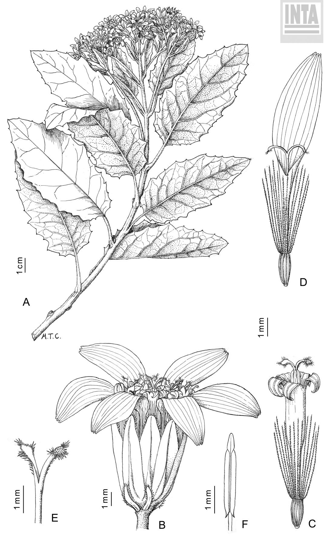 Arbustos densamente tomentosos, de 1,5-2 m de alto, con tallos hojosos hasta la inflorescencia. Hojas alternas, pecioladas, con pecíolos acanalados; láminas ovado-elípticas, de 8-11 × 3,5- 4,5 cm, redondeadas o subcordadas en la base, redondeadas y mucronadas en el ápice, irregulamente dentadas en el margen, con 4-5 dientes a cada lado, glabras y brillantes en la haz y densamente tomentosas en el envés. Capítulos radiados, numerosos, pedunculados, dispuestos en cimas corimbiformes pluricéfalas; pedúnculos de 5-25 mm de largo, densamente tomentosos. Involucro acampanado, de 7-9 × ca. 5 mm; brácteas del calículo pocas, lineares; filarios 8, oblongos, subagudos, glabros, 4 más anchos alternando con 4 más angostos. Flores dimorfas, con corolas amarillas, las del margen 5, con tubo ca. 5 mm de largo y lígula elíptica, ca. 5 × 2 mm, 3-dentada en el ápice; las del centro 12, corolas ca. 7 mm de largo, 5-lobadas; ramas del estilo con una coronita de pelos y en el centro un mechón más largo de pelos. Aquenios cilindroides, glabros. Papus formado por numerosos pelos rígidos, cortamente barbelados y desiguales en longitud, de color blancuzco.