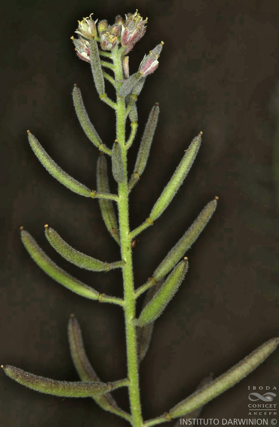 Hierbas anuales, raramente bienales, densamente pubescentes. Tallos erectos, a menudo solitarios desde la base, ramificados en la parte superior, de (30-)40-90(-110) cm de alto, pubescentes, con tricomas 3-7-radiados, de 0,1-0,4 mm de largo, a veces mezclados en la zona proximal con tricomas suaves, simples o 2-radiados, hasta de 1,2 mm de largo. Hojas basales no rosuladas, tempranamente marchitas; hojas caulinares medias sésiles, auriculadas a amplexicaules, oblongas a lanceoladas, de 2-8(-15) × 0,5-3(-5) cm, pubescentes, con tricomas 4-8-radiados, de 0,1-0,4 mm de largo, a veces mezclados con tricomas suaves, simples o 2-radiados, hasta de 1 mm de largo. Racimos alargados considerablemente durante la fructificación; pedicelos fructíferos horizontales a divaricado-ascendentes, densamente pubescentes, de (2-)5-12(-15) mm de largo. Sépalos oblongos, verdes a purpúreos, densamente pubescentes, de 1,5-2,5 × 0,5-1 mm; pétalos blancos, oblanceolados, de 1-2,5(-3,5) × 0,3-0,7(-1) mm, rara vez muy breves o ausentes; filamentos de 1,5-2,5 mm de largo; anteras oblongoides, de 0,4-0,8 mm de largo; óvulos (120-)150-250. Frutos angostamente oblongoides a lineares, de 0,8-1,5(-2) cm × 1,5-2 mm; valvas densamente pubescentes, con tricomas subsésiles; estilo de 0,2-0,6(-0,8) mm de largo. Semillas oblongoides, 2-seriadas o multiseriadas, de 0,4-0,55(-0,65) × 0,25- 0,35(-0,4) mm.