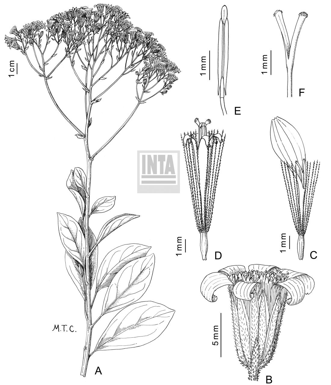 A. Rama florífera. B. Capítulo. C. Flor del margen. D. Flor del centro. E. Estambre. F. Porción superior del estilo.