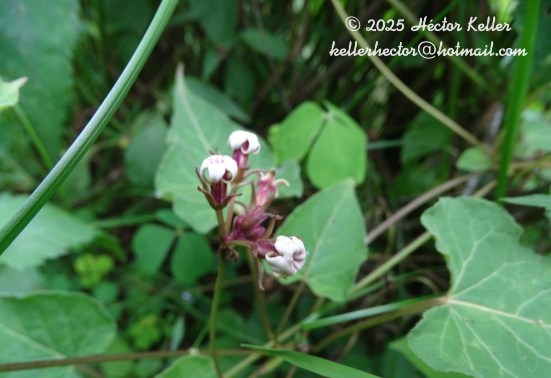 Voluble de varios metros de alto, con tallos pubescentes. Hojas con pecíolo de 2,5-3,5 cm de largo, escasamente pubescente; lámina ovado-triangular, de 7-10 × 3-6 cm, de base cordada, ápice largamente acuminado, cara adaxial pubescente, cara abaxial tomentosa, discoloras. Inflorescencias umbeliformes, multifloras, con el pedúnculo de 5-6 cm de largo, pubescente. Flores con pedicelo de 10-15 mm de largo, pubescente; cáliz con lóbulos linear-lanceolados, de 5 × 1 mm, cara abaxial pubescente, cara adaxial con abundantes tricomas rojizos y con coléteres debajo del seno; corola con tubo cilíndrico, de 6-7 × 2 mm, brevemente ensanchado en la base, externamente pubescente, internamente glabro, lóbulos triangulares, de 4 × 3 mm, cara abaxial pubescente, cara adaxial glabra; ginostegio con el estípite de 4-8 mm de alto, anteras de 1 mm de largo, membrana apical suborbicular, de 0,45 × 0,55 mm; cabeza estilar plana; polinarios con el retináculo romboidal o subtriangular, de 0,3-0,4 × 0,08-0,12 mm, caudículas horizontales a levemente descendentes, de 0,1 mm de largo, polinios piriformes, de 0,4-0,5 × 0,15-0,22 mm, algo comprimidos. Folículos y semillas no vistos.