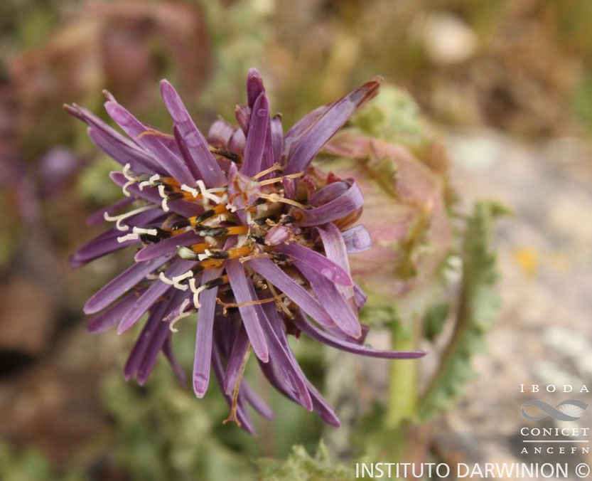 Hierbas caulescentes, de 7-40 cm de alto, densamente glanduloso-pubescentes. Hojas inferiores dispuestas en roseta, generalmente rodeadas por restos de pecíolos de hojas viejas y secas, largamente pecioladas, lanceoladas a oblanceoladas, de 3-12 × 0,5-3 cm, atenuadas en la base, agudas en el ápice, sinuadas, crenado-dentadas o pinnatisectas, margen crespo y retorcido, irregularmente denticulado, con cilias espiniformes, glanduloso-pubescentes o glabras en ambas caras; hojas superiores numerosas a escasas, ovado- u oblongo-lanceoladas. Capítulos solitarios o 2-20, formando una cima racemiforme laxa o densa y espiciforme. Involucro de (15-)20-40 × 10-20 mm; filarios 3-5-seriados, angostamente escariosos en el margen, glanduloso-pubescentes, los externos oblongo- u ovadolanceolados, enteros o espinuloso-ciliados en el margen, los internos lanceolados. Flores 20-60, corola azul, blanca, amarillenta, violácea, verdoso-violácea, lilacina, las del margen con tubo de 11-15 mm de largo, labio exterior de 6-10 mm de largo. Aquenios truncados en el ápice, seríceo-velludos, con tricomas blanquecinos o dorados. Papus de 15-20 mm de largo, leonado.