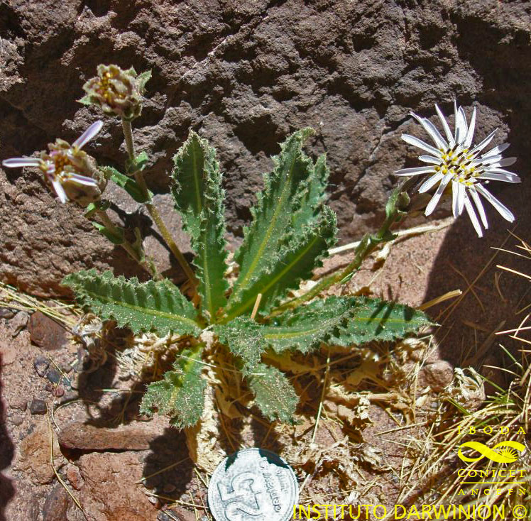 Hierbas caulescentes, de 7-40 cm de alto, densamente glanduloso-pubescentes. Hojas inferiores dispuestas en roseta, generalmente rodeadas por restos de pecíolos de hojas viejas y secas, largamente pecioladas, lanceoladas a oblanceoladas, de 3-12 × 0,5-3 cm, atenuadas en la base, agudas en el ápice, sinuadas, crenado-dentadas o pinnatisectas, margen crespo y retorcido, irregularmente denticulado, con cilias espiniformes, glanduloso-pubescentes o glabras en ambas caras; hojas superiores numerosas a escasas, ovado- u oblongo-lanceoladas. Capítulos solitarios o 2-20, formando una cima racemiforme laxa o densa y espiciforme. Involucro de (15-)20-40 × 10-20 mm; filarios 3-5-seriados, angostamente escariosos en el margen, glanduloso-pubescentes, los externos oblongo- u ovadolanceolados, enteros o espinuloso-ciliados en el margen, los internos lanceolados. Flores 20-60, corola azul, blanca, amarillenta, violácea, verdoso-violácea, lilacina, las del margen con tubo de 11-15 mm de largo, labio exterior de 6-10 mm de largo. Aquenios truncados en el ápice, seríceo-velludos, con tricomas blanquecinos o dorados. Papus de 15-20 mm de largo, leonado.