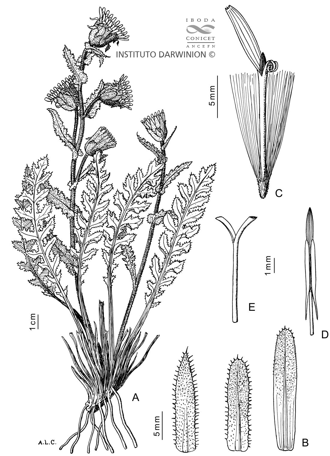 Hierbas caulescentes, de 7-40 cm de alto, densamente glanduloso-pubescentes. Hojas inferiores dispuestas en roseta, generalmente rodeadas por restos de pecíolos de hojas viejas y secas, largamente pecioladas, lanceoladas a oblanceoladas, de 3-12 × 0,5-3 cm, atenuadas en la base, agudas en el ápice, sinuadas, crenado-dentadas o pinnatisectas, margen crespo y retorcido, irregularmente denticulado, con cilias espiniformes, glanduloso-pubescentes o glabras en ambas caras; hojas superiores numerosas a escasas, ovado- u oblongo-lanceoladas. Capítulos solitarios o 2-20, formando una cima racemiforme laxa o densa y espiciforme. Involucro de (15-)20-40 × 10-20 mm; filarios 3-5-seriados, angostamente escariosos en el margen, glanduloso-pubescentes, los externos oblongo- u ovadolanceolados, enteros o espinuloso-ciliados en el margen, los internos lanceolados. Flores 20-60, corola azul, blanca, amarillenta, violácea, verdoso-violácea, lilacina, las del margen con tubo de 11-15 mm de largo, labio exterior de 6-10 mm de largo. Aquenios truncados en el ápice, seríceo-velludos, con tricomas blanquecinos o dorados. Papus de 15-20 mm de largo, leonado.
