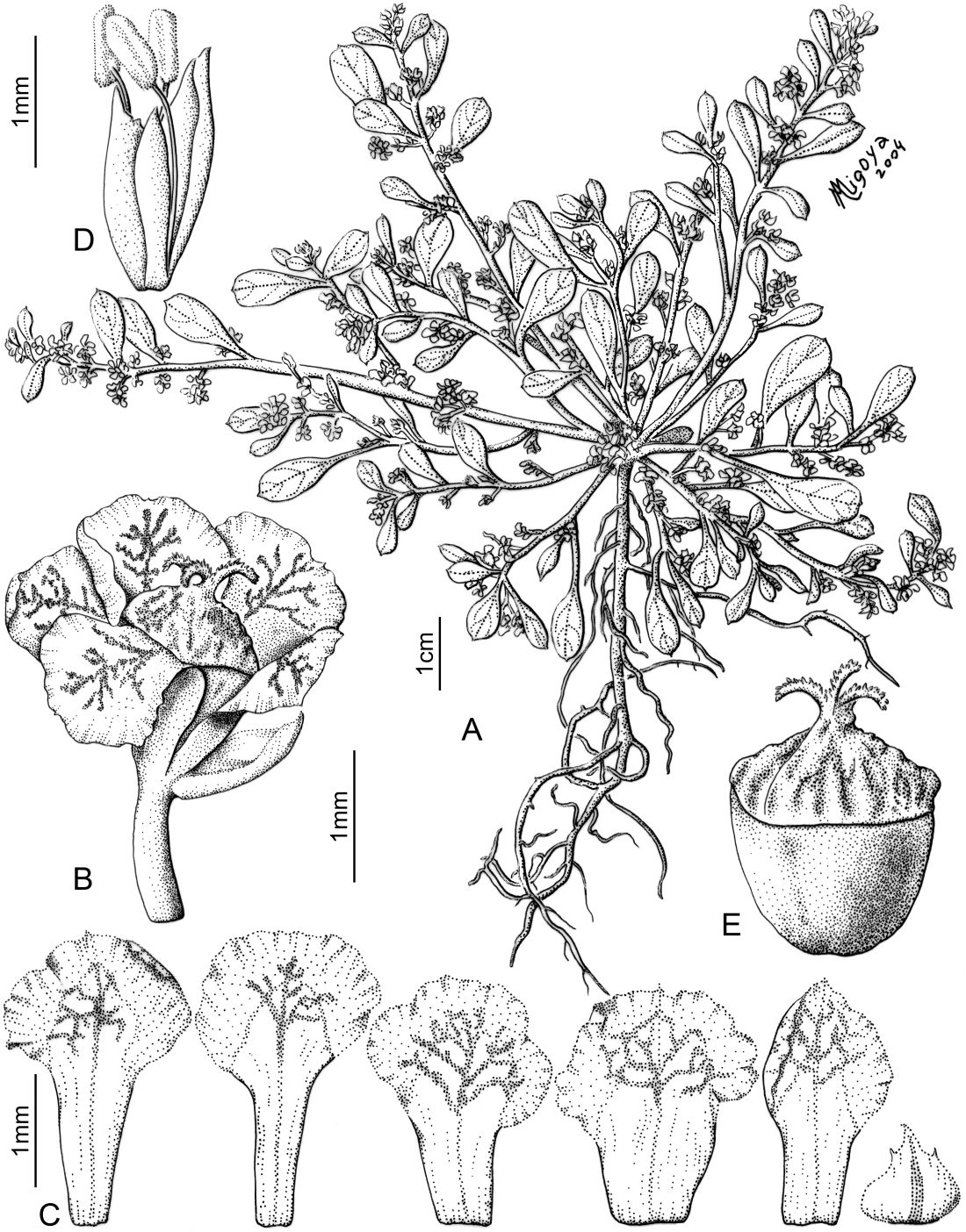 Hierbas anuales; tallos principales postrados o ascendentes, de 3-14 cm de alto, ramificados en la base, no así en la parte distal, delgados, glabros. Hojas con pecíolos de 4-11 mm de largo, glabras; láminas generalmente espatuladas, a veces elípticas u oblongas, no onduladas, de 10-17 × 3-9 mm, atenuadas o cuneadas en la base, redondeadas o apenas emarginadas en el ápice, de color verde claro, con un mucrón de 0,5-1 mm de largo. Inflorescencias axilares, en glomérulos redondeados, hasta de 7 mm de diámetro, verdosos o blanquecinos, los que a veces se reúnen en una pseudoespiga breve, hasta de 2 cm de largo, apretada, hojosa, originada en la brevedad de los entrenudos apicales; brácteas y bractéolas deltoides, ovadas, elípticas hasta orbiculares, de 0,9-1,3 mm de largo, más cortas que los sépalos, blanquecinas, escarioso-membranáceas, con la vena media de color verde, mucrón de 0,2-0,3 mm de largo. Flores de ambos sexos en la misma inflorescencia. Flores estaminadas con (2-)3-5 sépalos oblongos, ovados a elípticos, de 1,3-2 mm de largo, subagudos a obtusos, escariosos, con la vena media de color verde, estambres (2-)3-4. Flores pistiladas con 5 sépalos ampliamente espatulados, de 1,7-2,5 mm de largo, con la lámina de 1,4-2,5 mm de ancho, redondeada, adelgazados en una uña de 0,2-0,6 mm de ancho, esponjosos en la base, doblados hacia fuera; flores más anchas que largas; estigmas 3, de 0,12-0,40 mm de largo, delgados. Frutos dehiscentes, con el opérculo rugoso, presentando costillas curvas, más cortos que los sépalos, urna lisa. Semillas de color castaño rojizo a negruzco, de 0,9-1,3 × 0,5-0,55 mm, lisas y brillantes en el área central, finamente punteadas y opacas en el área marginal.